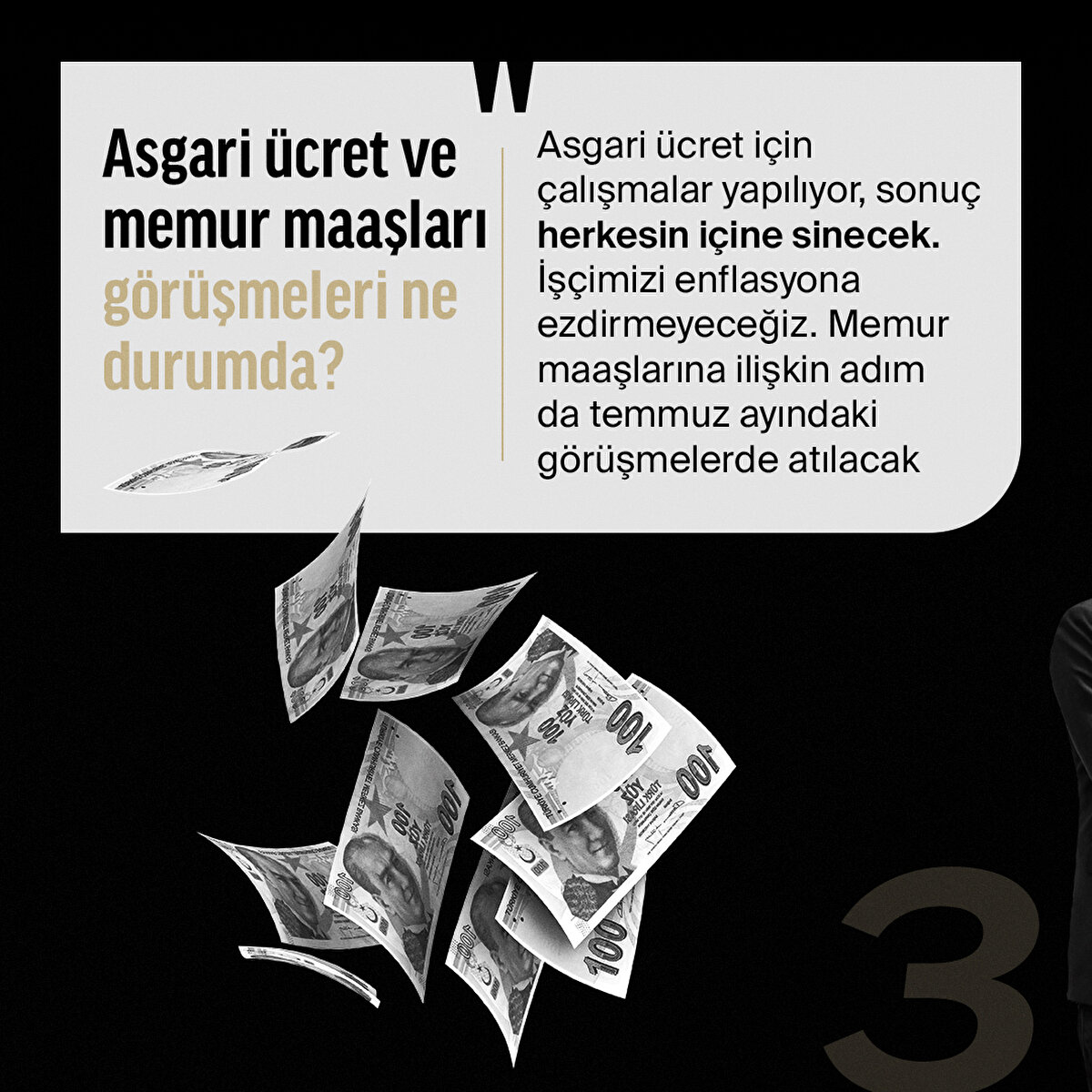 Cumhurbaşkanı Recep Tayyip Erdoğan, ekonomiye yönelik önemli mesajlar verdi. Faiz politikasında ciddi değişime gidildiği yanılgısına düşülmemesi gerektiğini belirtti. Cumhurbaşkanı Erdoğan, asgari ücretle ilgili olarak, "Asgari ücret noktasında biz kesinlikle işçimizi yine enflasyona ezdirmeyeceğiz" diye konuştu. Erdoğan, Türkiye'nin dış politikada atacağı adımlar konusunda da kritik başlıklara değindi.