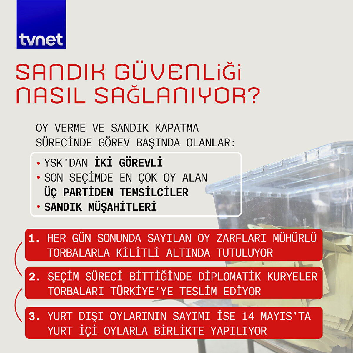 14 Mayıs seçimleri için 3 milyonu aşkın seçmen 70'ten fazla ülkede sandık başına gidiyor. Yurt dışından vatandaşlar dış temsilciliklere ve sınır kapılarına kurulan sandıklarda 9 Mayıs'a kadar oy kullanabilecekler. Tabii akıllarda birçok soru var: Yurt dışında sandık güvenliği nasıl sağlanıyor? Yurt dışı seçmenleri seçim sonucu üzerinde ne kadar etkili? Yurt dışı oyları yurt içi oylara nasıl yansıtılıyor?... Daha birçok soruyu sizler için cevapladık.