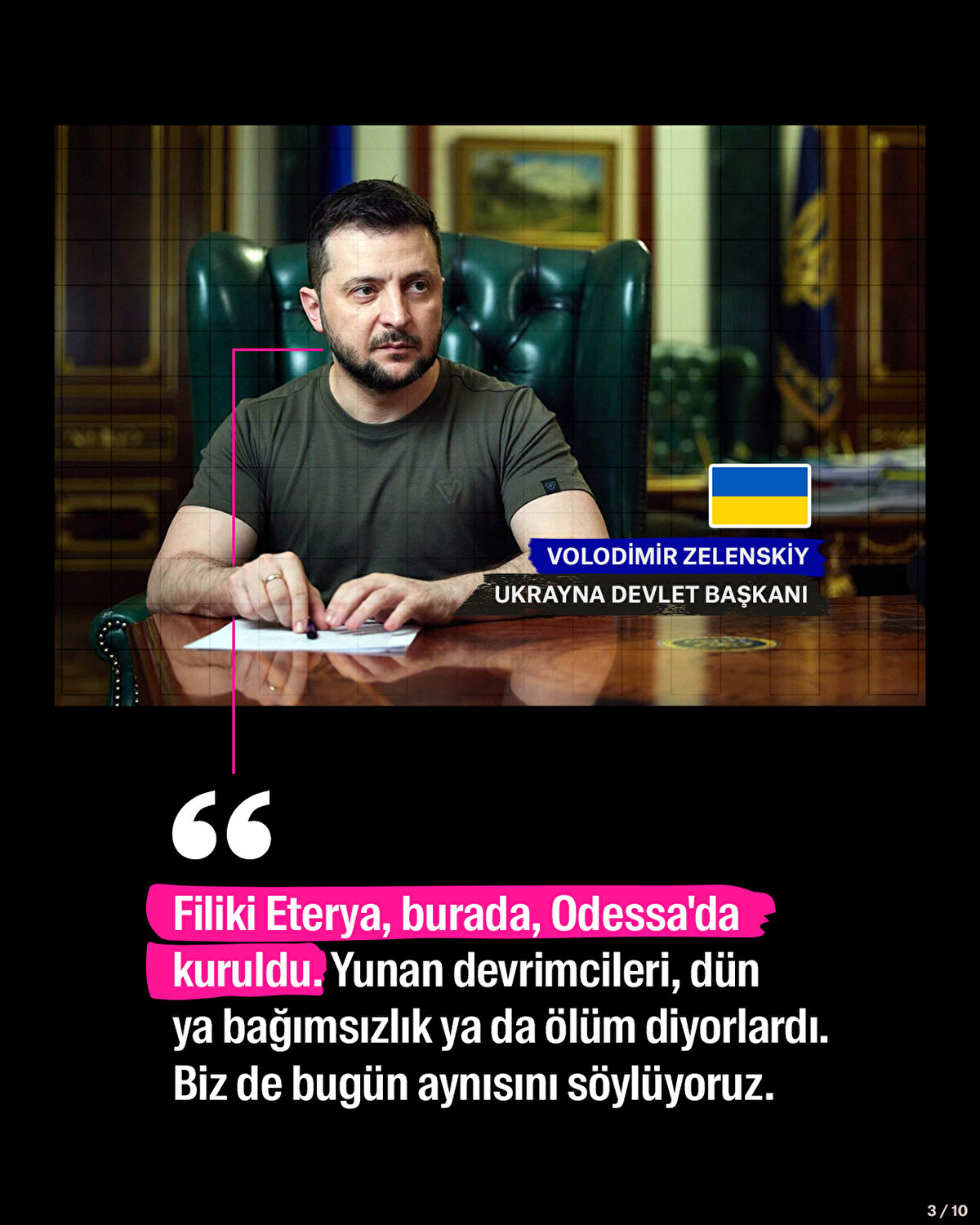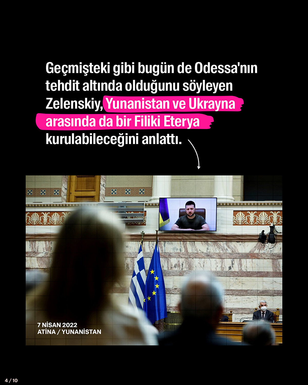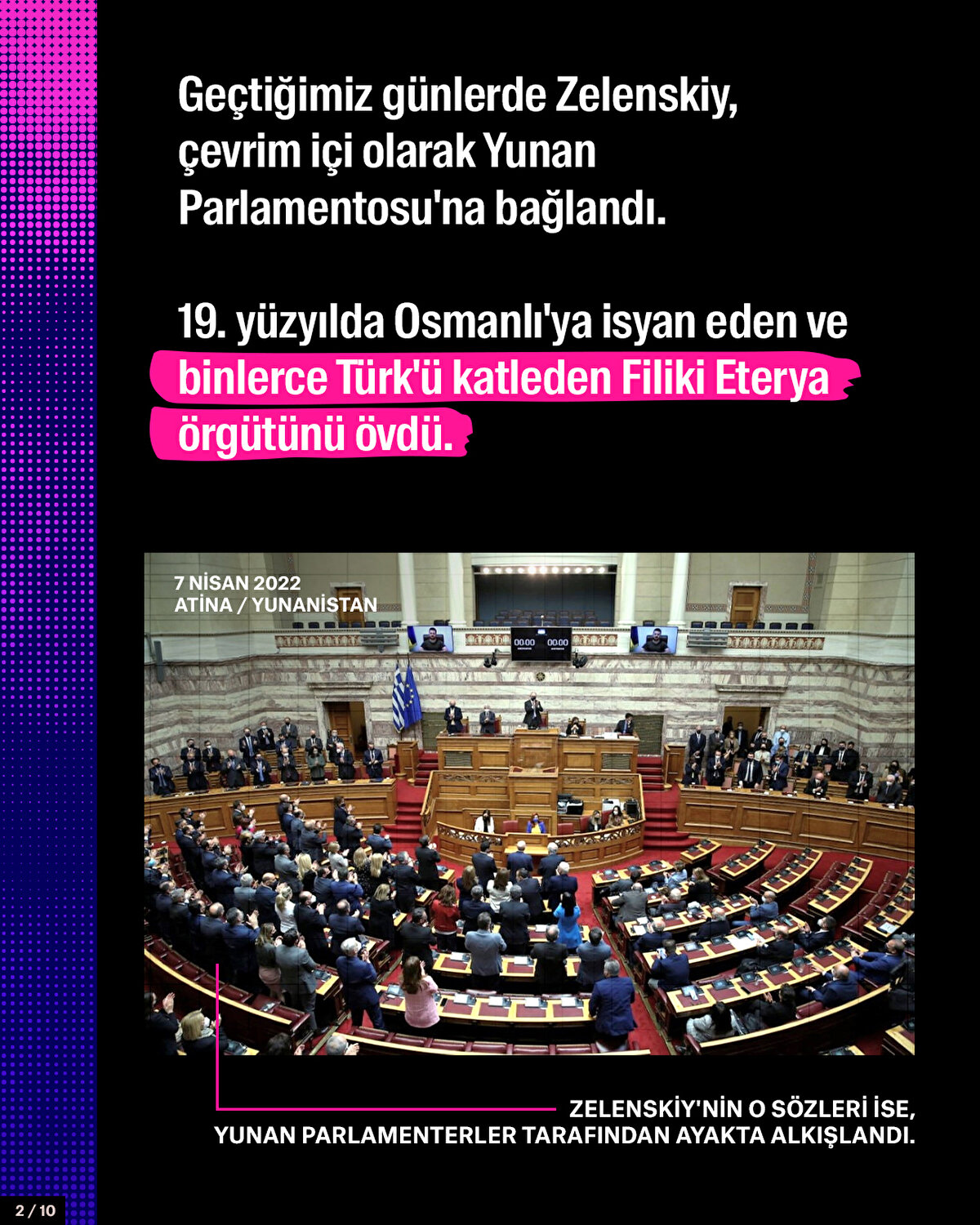 Geçtiğimiz günlerde Zelenskiy, çevrim içi olarak Yunan Parlamentosu'na bağlandı. 19. yüzyılda Osmanlı'ya isyan eden ve binlerce Türk'ü katleden Filiki Eterya örgütünü övdü.