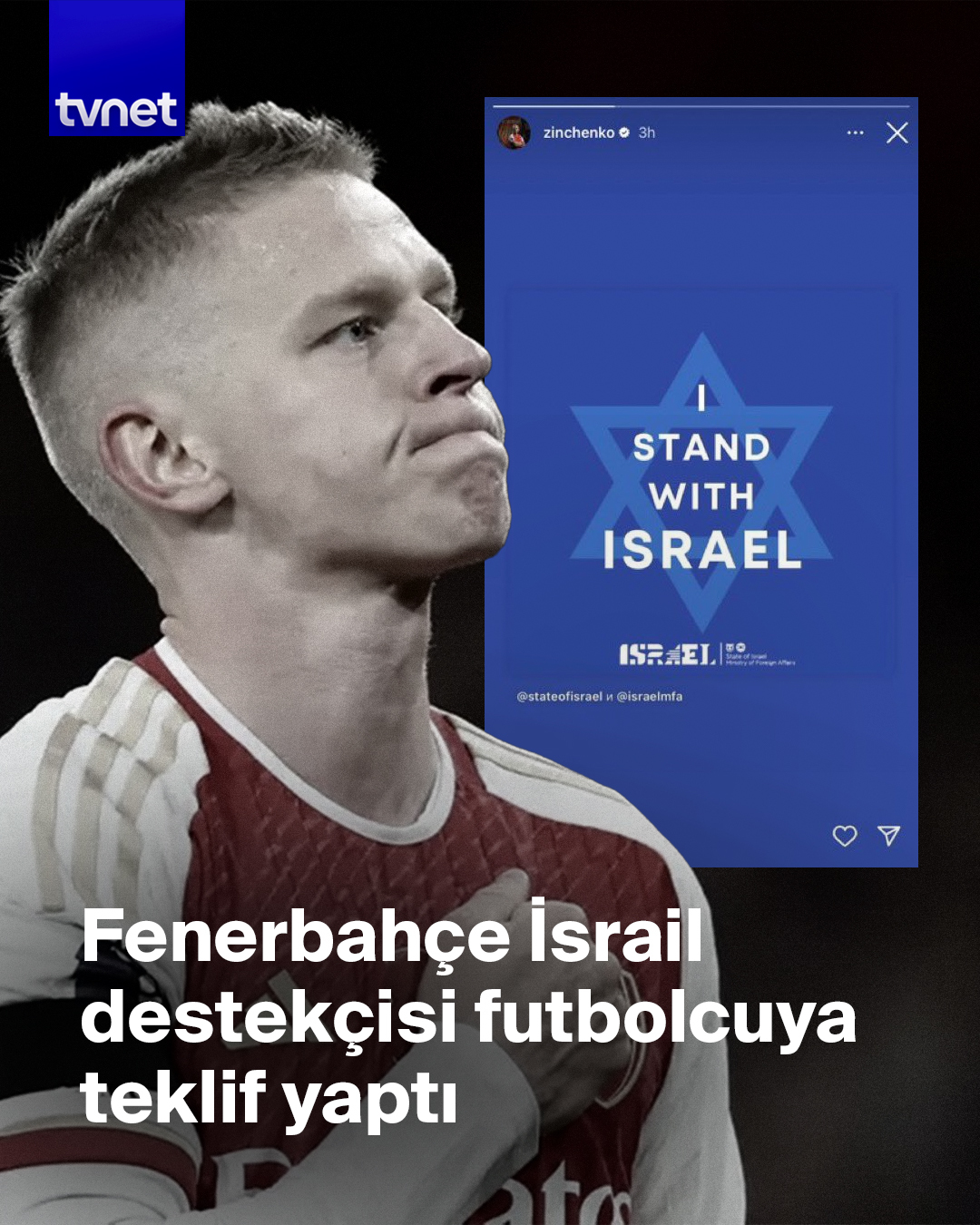Fenerbahçe, Arsenal'den Oleksandr Zinchenko için resmi teklif yaptı. Ancak oyuncunun İsrail'i destekleyen bir paylaşımı nedeniyle taraftarlar büyük tepki gösterdi. Taraftarlar, “Terör devleti İsrail'e destek veren bir oyuncunun formasını giymesini kabul edemeyiz” diyerek yönetimi protesto etti ve transferin iptal edilmesini istedi.