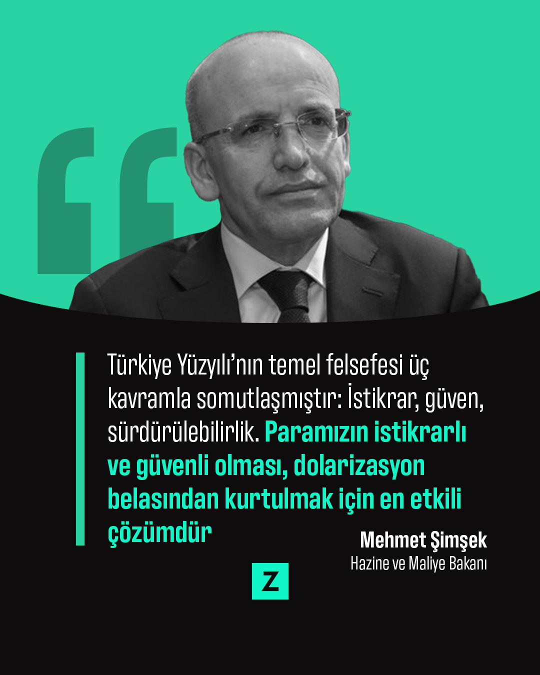 Hazine ve Maliye Bakanı Mehmet Şimşek, "Türkiye Yüzyılı'nın temel felsefesi üç kavramla somutlaşmıştır: İstikrar, Güven, Sürdürülebilirlik… Önümüzdeki dönemde izleyeceğimiz ekonomi politikamız da bu kavramlar ekseninde şekillenecek" dedi.