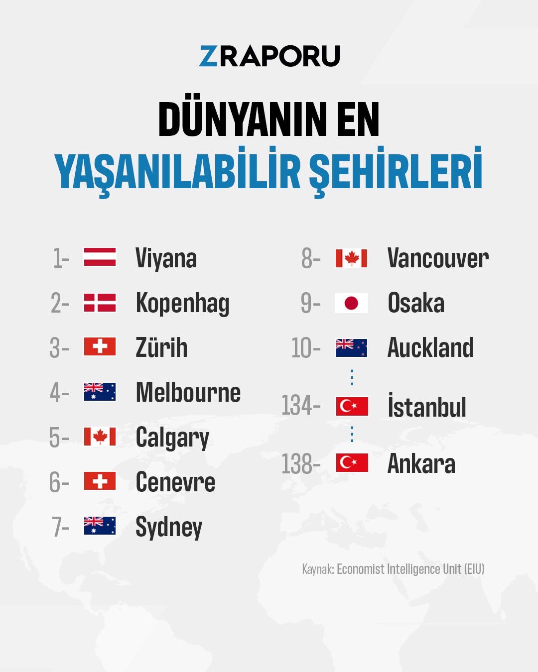 EUI dünyanın en yaşanılabilir şehirlerini açıkladı. Listede İstanbul 134. sırada yer alırken Ankara 138. basamakta kendine yer buldu. Peki siz bu şehirlerden hangisinde yaşamak isterdiniz?