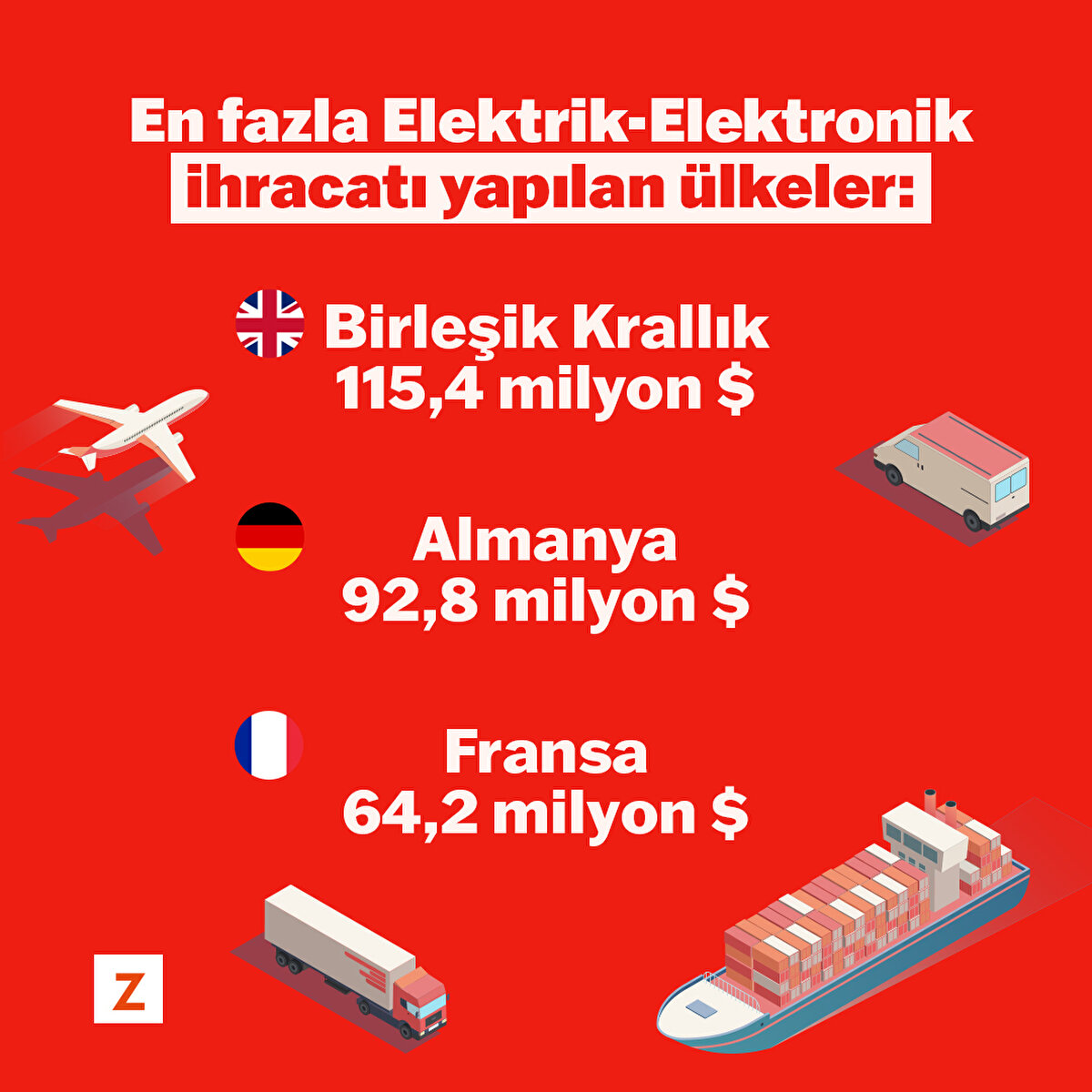 Elektrik-elektronik sektörünün ocak ayı ihracatı 2021'in aynı dönemine kıyasla yüzde 9,9 artarak 982,9 milyon dolar oldu. En fazla elektrik-elektronik ihracatı yapılan ülkeler Birleşik Krallık, Almanya ve Fransa oldu.