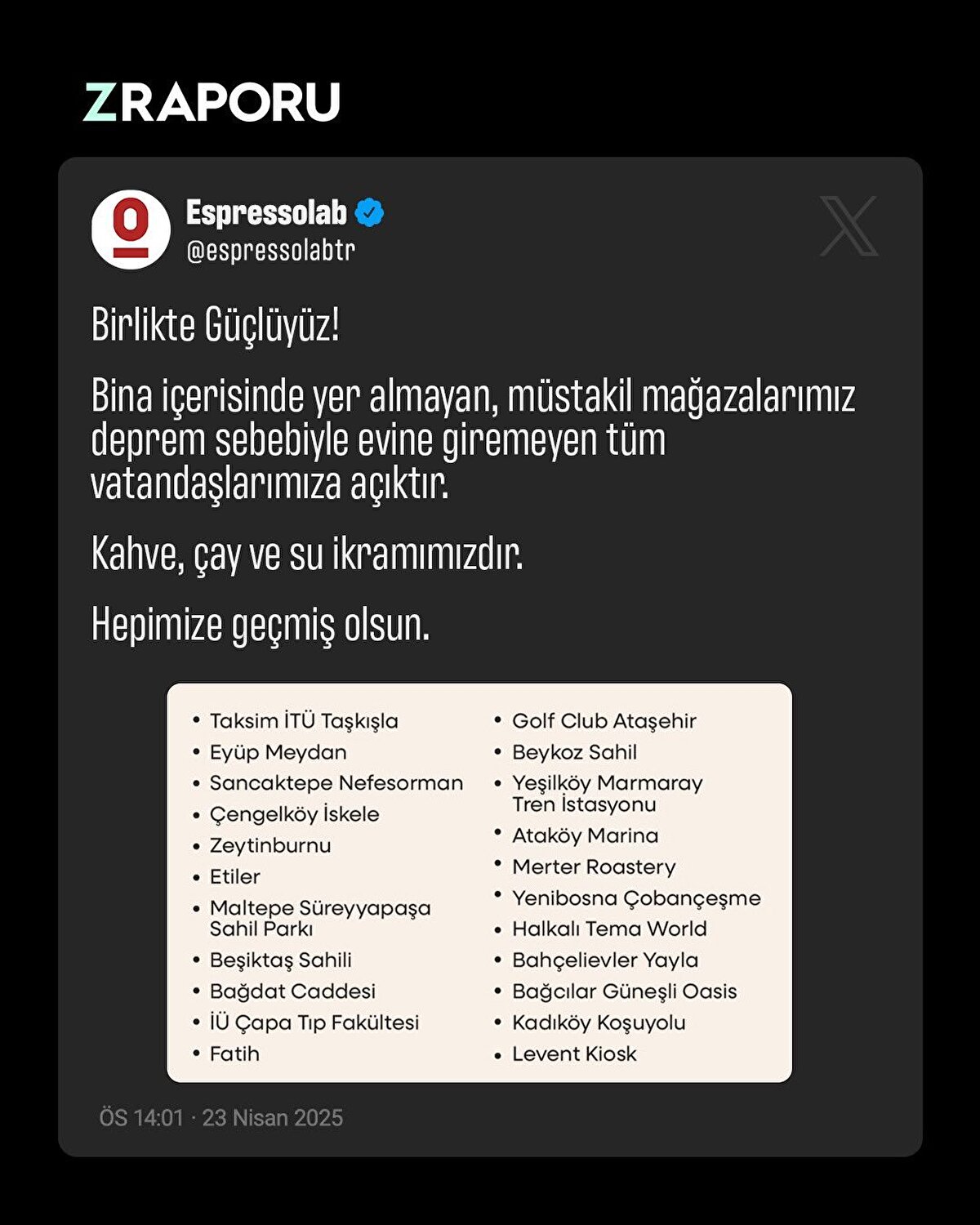 Espressolab deprem sonrası çağrı yaptı. Marka, deprem nedeniyle evine giremeyen vatandaşlara ücretsiz kahve, çay ve su ikram edeceğini açıkladı. Şubeleri görmek için yana kaydırın