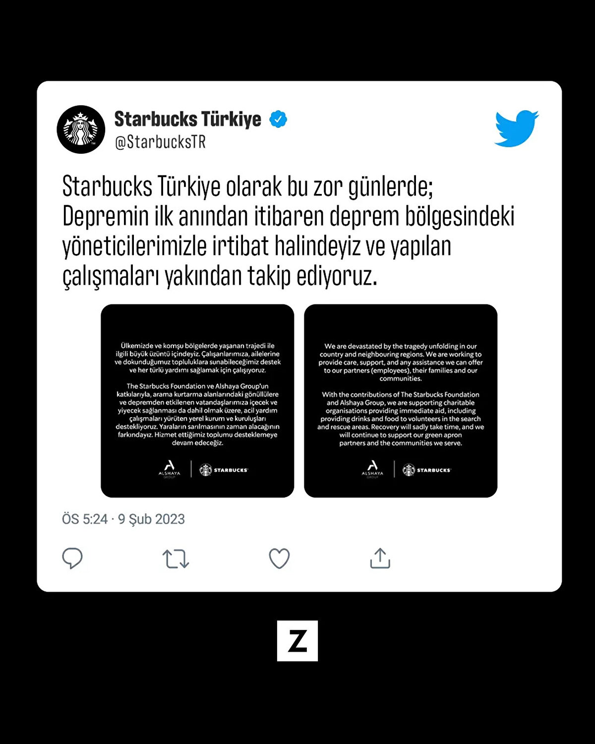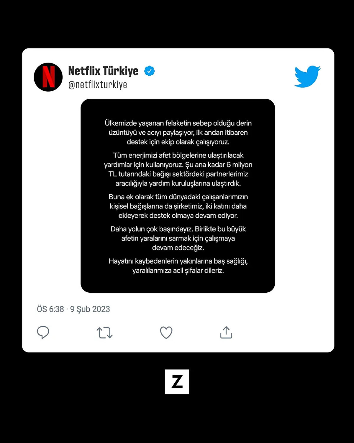 📍Gelen tepkiler üzerine Netflix ve Starbucks depreme destek mesajını yayınladı.