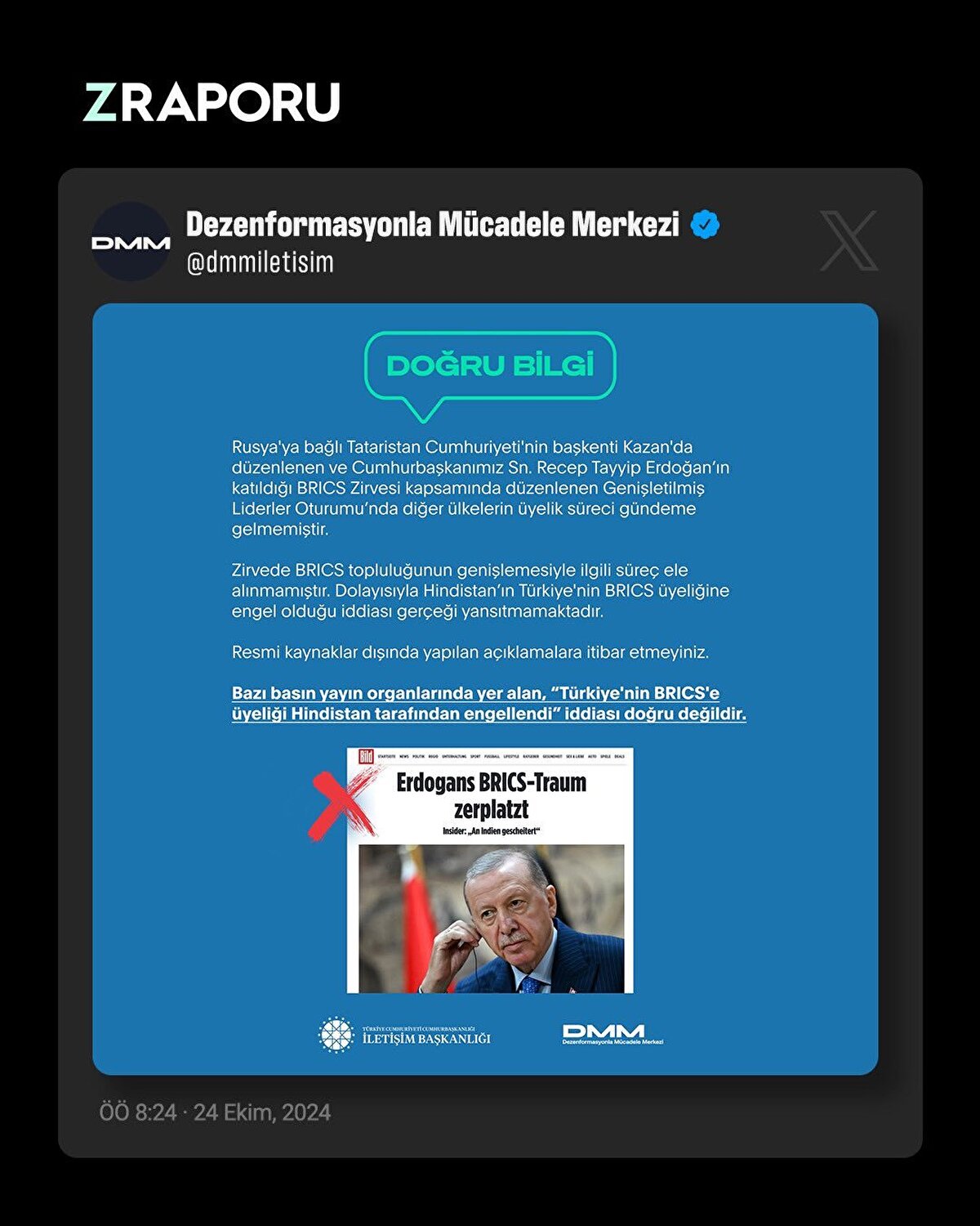Alman medya kuruluşu BILD tarafından ortaya atılan ''Hindistan, Türkiye'nin BRICS'e katılımını engelledi'' iddiaları Dezenformasyonla Mücadele Merkezi tarafından yalanlandı