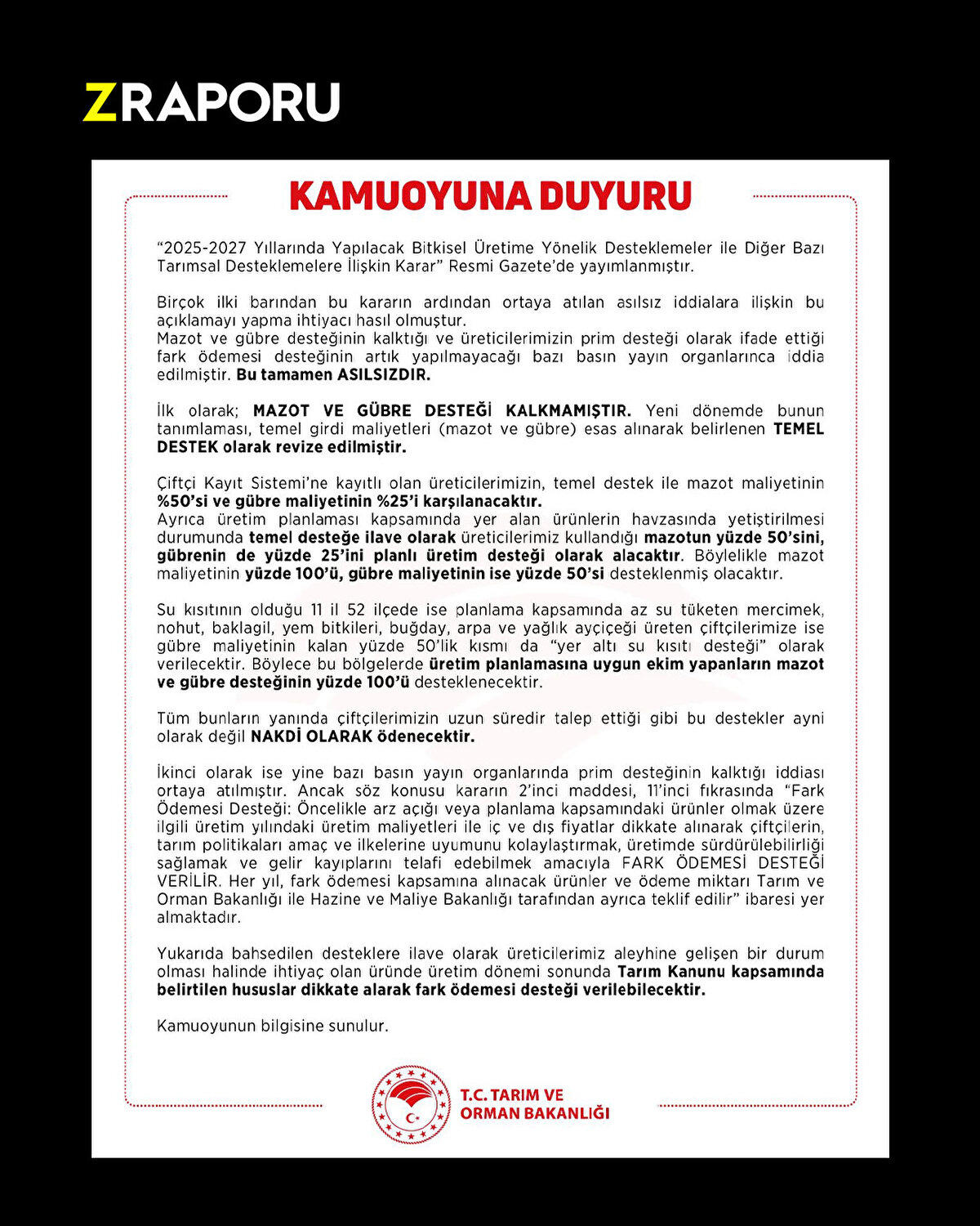 ❎Tarım ve Orman Bakanlığı, 2025 yılından itibaren çiftçilere ödenen mazot ve gübre desteğinin kesileceği yönündeki iddiaları yalanladı