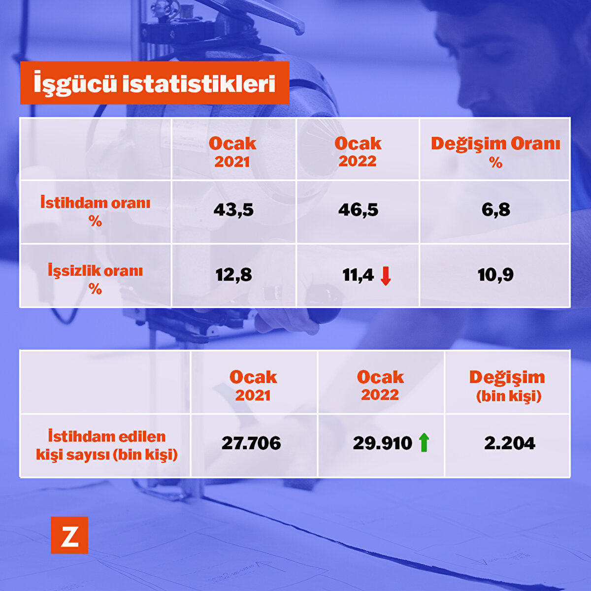 İstihdam oranı Ocak 2022’de bir önceki yılın aynı ayına göre %6,8 artış gösterdi ve %46,5 seviyesinde gerçekleşti