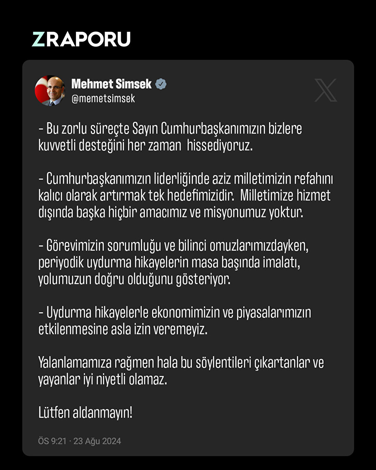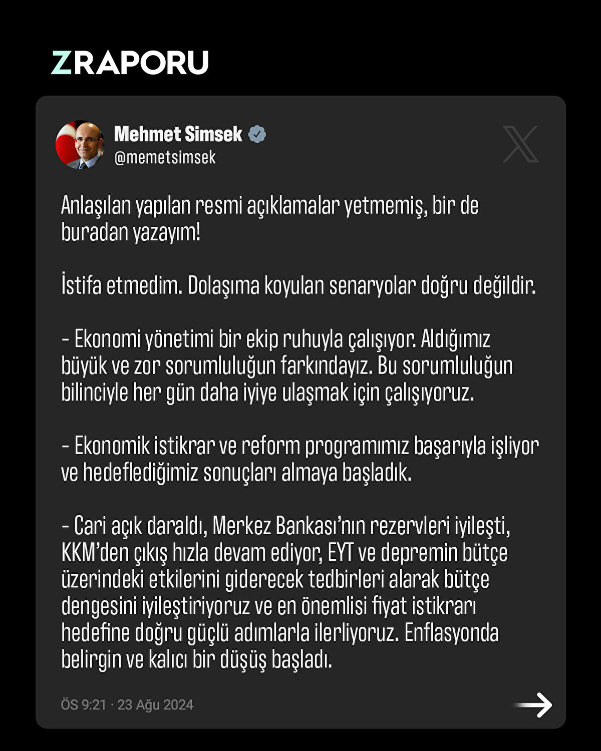 Hazine ve Maliye Bakanı Mehmet Şimşek, istifa ettiğine dair iddiaları yalanladı