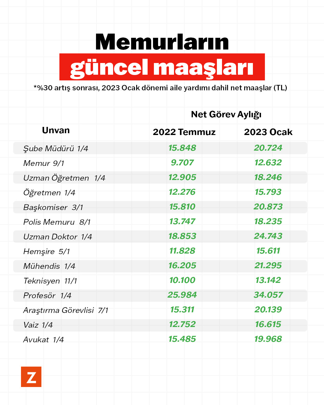 2023 yılı Ocak ayından geçerli olmak üzere kamu görevlileri ile memur emeklilerinin tamamının aylık ve ücretlerinde %8 oranında artış öngörülmüştü. 2022 yılı ikinci altı aylık döneminde enflasyon %15,40 gerçekleşti. Gerçekleşen bu enflasyon oranından kaynaklı olarak ilave %8,48 artış ile birlikte kamu görevlileri ile memur emeklilerinin aylık ve ücretlerinde 2023 yılı Ocak ayından geçerli olmak üzere toplamda %16,48 oranında, SSK ve Bağ-Kur emekli aylıklarında ise gerçekleşen enflasyona bağlı olarak %15,40 oranında artış sağlanacaktı. Ancak Cumhurbaşkanı Recep Tayyip Erdoğan tarafından açıklandığı üzere bu oranlar %30 olarak uygulanacak.