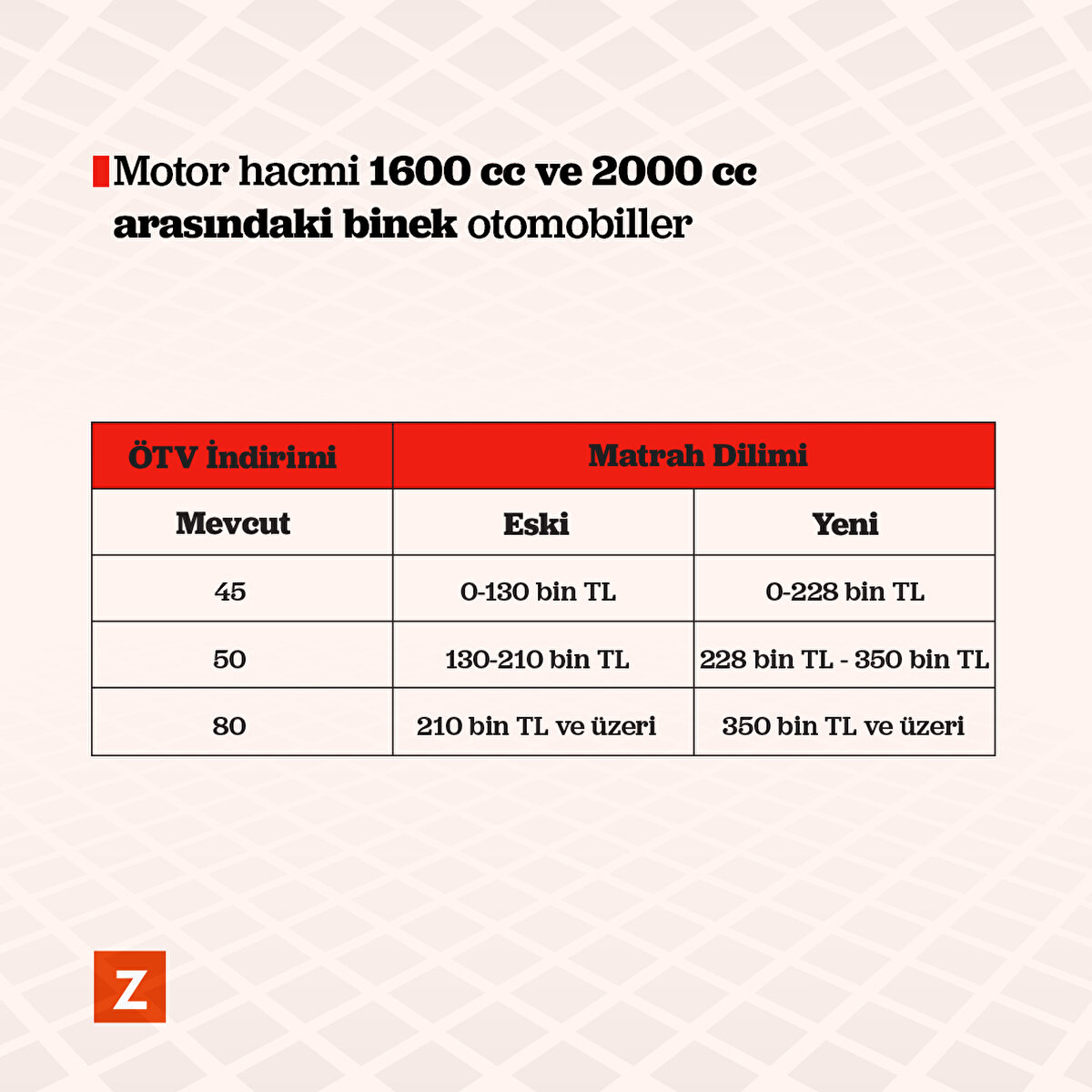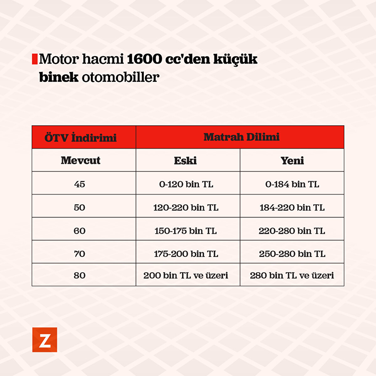 Düzenlemeyle birlikte 1600 cc altı otomobillerde vergiler dahil satış fiyatı 594 bin 722 liranın üstünde olan otomobillerin fiyatında herhangi bir değişiklik olmazken yüzde 45 ÖTV oranı için esas alınan ÖTV matrah eşiğinin 120 bin liradan 184 bin liraya çıkarılmasıyla vergiler dahil satış fiyatı 212 bin 401-369 bin 104 lira arasında olan otomobillerin fiyatının 7 bin ila 54 bin lira arasında düşmesi bekleniyor.