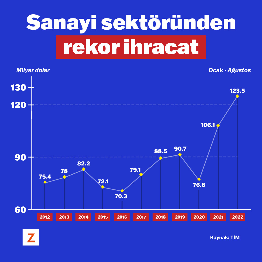 Küresel çapta enerji krizinden kaynaklı ham madde arzına ilişkin sıkıntıların yoğun olarak yaşandığı bir ortamda Türk sanayi sektörü ihracatta rekorlar yenilemeye devam ediyor. Türkiye'nin sanayi ihracatı, 123 milyar 54 milyon dolarla tüm zamanların en yüksek ocak-ağustos ihracat rakamını yakaladı. Sanayi sektörünün dış satımı yılın sekiz ayında geçen yılın aynı dönemine göre yüzde 15,9 arttı. Sanayi dış satımının toplam ihracat içerisindeki payı da yüzde 74,3 oldu.