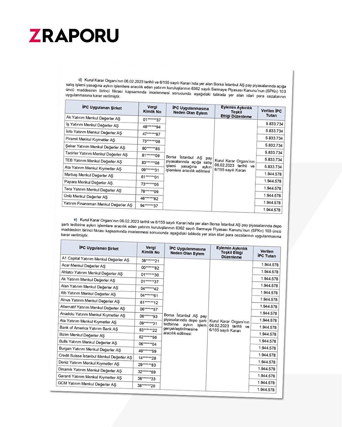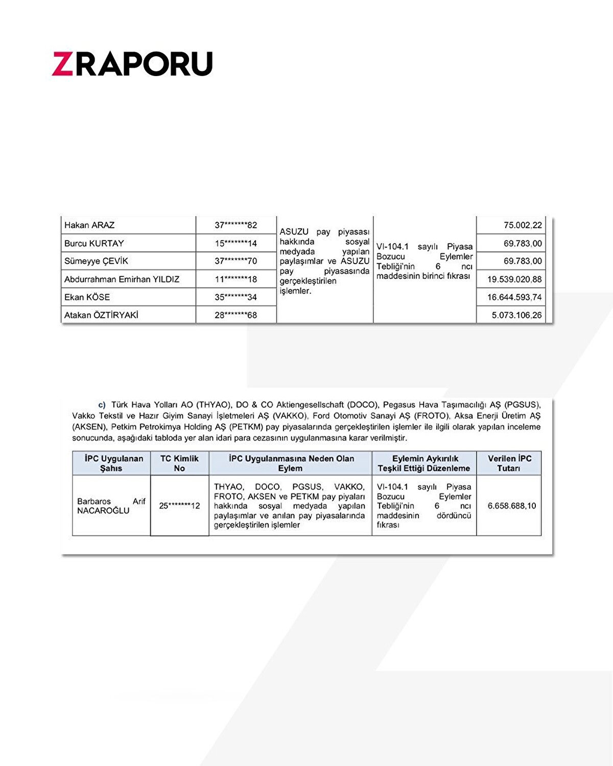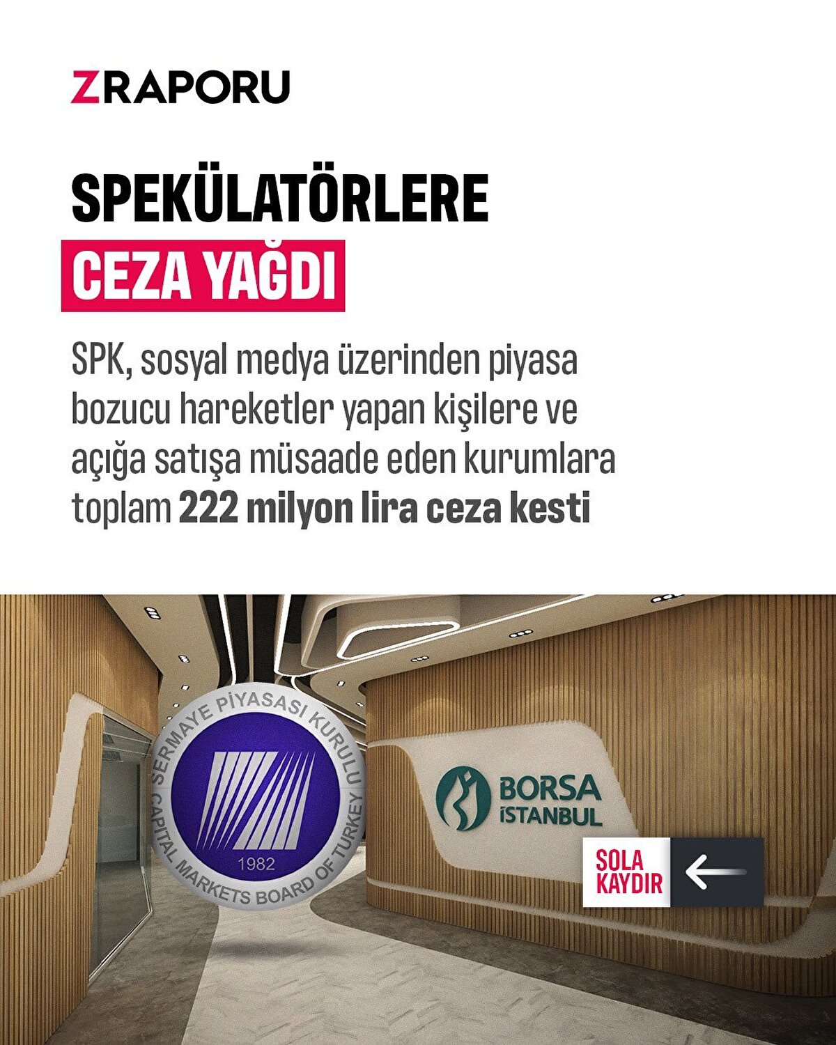 SPK, sosyal medya üzerinden spekülasyon yapan ve açığa satışa müsaade eden aracı kurumlara ceza yağdırdı. ASUZU hisseleri hakkında paylaşım yapan iki kişiye 36,1 milyon lira, THYAO, DOCO, PGSUS, VAKKO, FROTO, AKSEN, PETKM paylaşımı yapan bir kişiye 6,6 milyon ceza kesildi. Toplam kesilen ceza aracı kurumlar dahil 222 milyon lira olarak açıklandı.