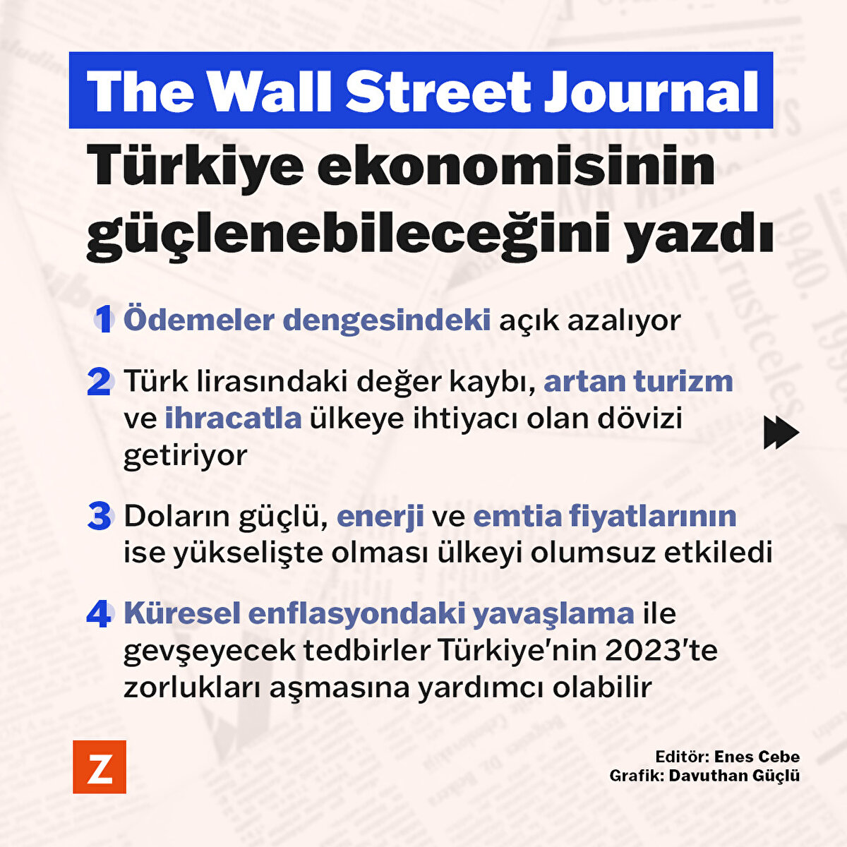 Makalede, söz konusu sebeplerin doların güçlü, petrol ve emtia fiyatlarının ise yükselişte olduğu bu yılda Türkiye'nin en çok zorlanan ülkelerden biri olduğuna dikkati çekilerek, küresel enflasyondaki yavaşlama ile Türkiye'nin 2023'te bu tür zorlukları aşabileceği belirtildi.