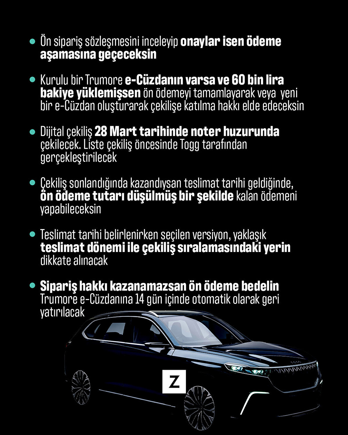 Trumore uygulamasını indiren veya Togg websitesi üzerinden Tru.ID oluşturan her bir tekil kullanıcı, nakit ya da kredi kartı aracılığıyla cüzdanlarına aktardıkları 60 bin lira ön ödemeyi yaparak, çekiliş sürecine katılmaya hak kazanacak.