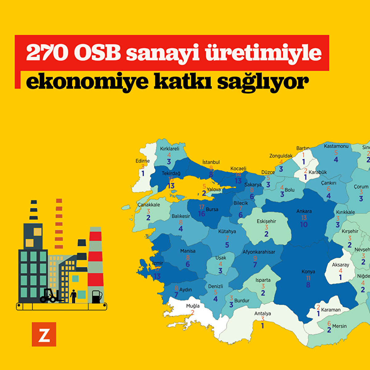 Türkiye'de planlı sanayileşmenin temel taşı olan organize sanayi bölgeleri (OSB), ülkenin dört bir yanında üretim ve ihracata katkıda bulunuyor. OSB'ler, Türkiye'de sanayinin gelişmesine katkı sağlamayı ve geri kalmış bölgelerin kalkınmalarını teşvik ederek sanayi yatırımlarını bu bölgelere çekmeyi hedefliyor.