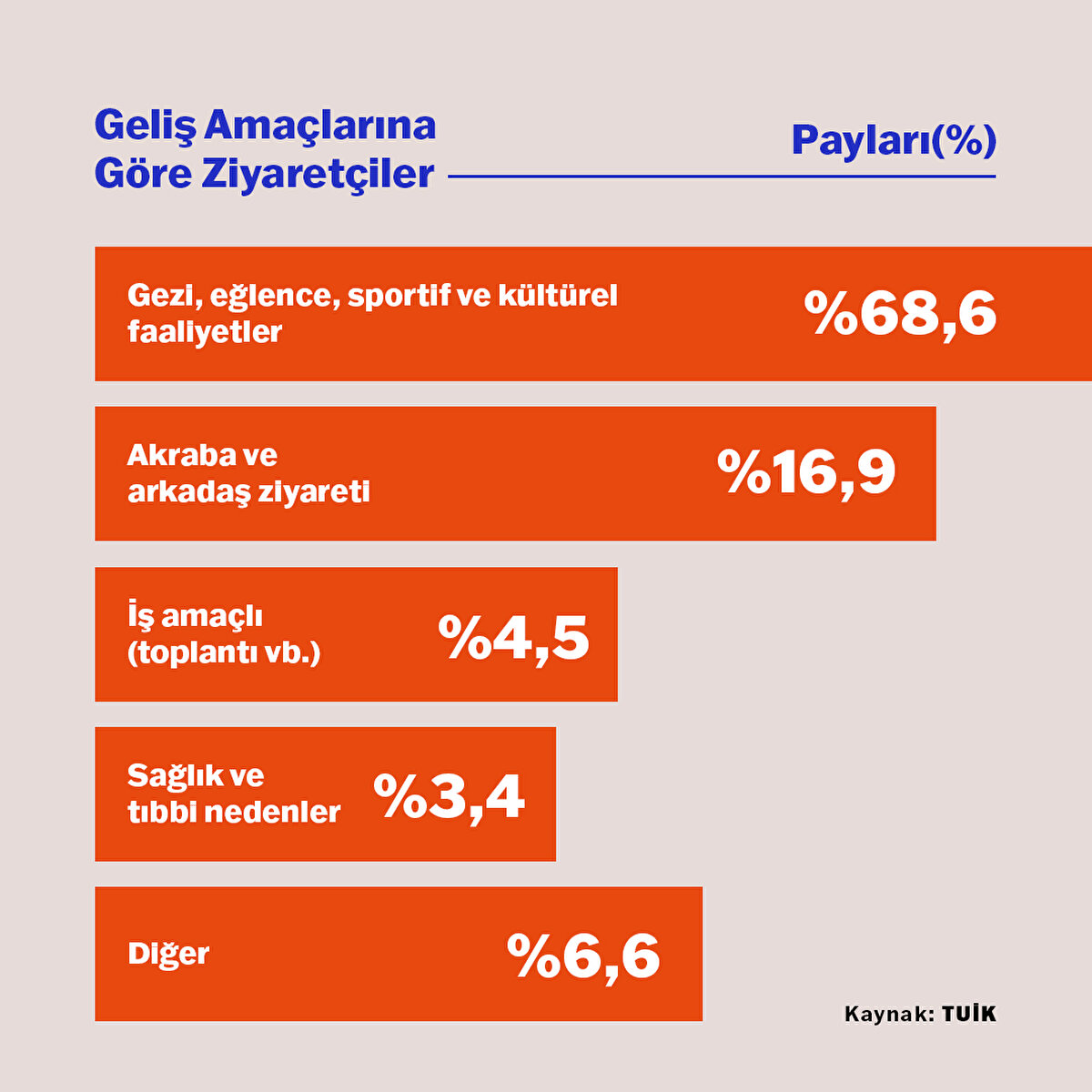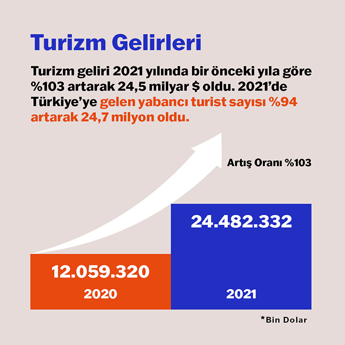 Türkiye'nin turizm geliri, 2021'de bir önceki yıla göre yüzde 103 artarak 24 milyar 482 milyon 332 bin dolara yükselirken, ülkeden çıkış yapan ziyaretçi sayısı 29 milyon 357 bin 463 kişi oldu.