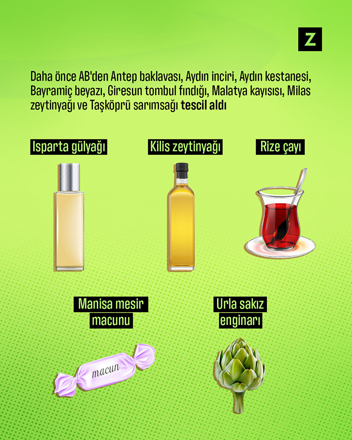TÜRKPATENT, Ayaş domatesi, Bingöl balı, Bursa şeftalisi, Ezine peyniri, Hüyük çileği, Isparta gülyağı, Kilis zeytinyağı, Manisa mesir macunu, Rize çayı ve Urla sakız enginarı için AB Komisyonuna coğrafi işaret tescil başvurusu yaptı.