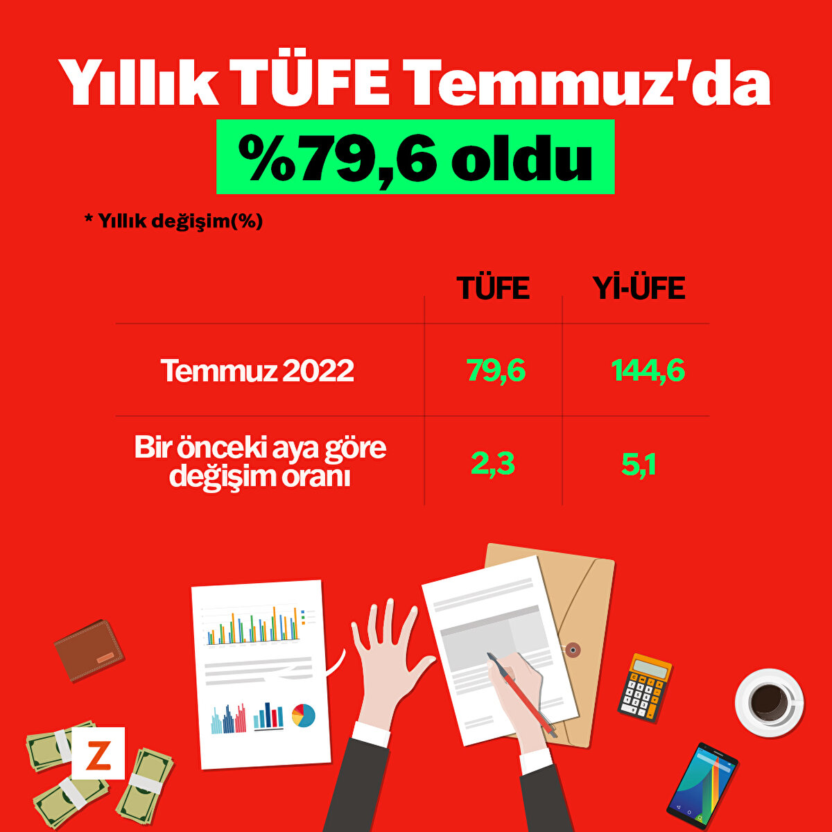 Tüketici Fiyat Endeksi (TÜFE) temmuzda aylık bazda %2,37, Yurt İçi Üretici Fiyat Endeksi (Yİ-ÜFE) %5,17 artış gösterdi. Yıllık enflasyon tüketici fiyatları %79,6, yurt içi üretici fiyatları %144,61 oldu.
