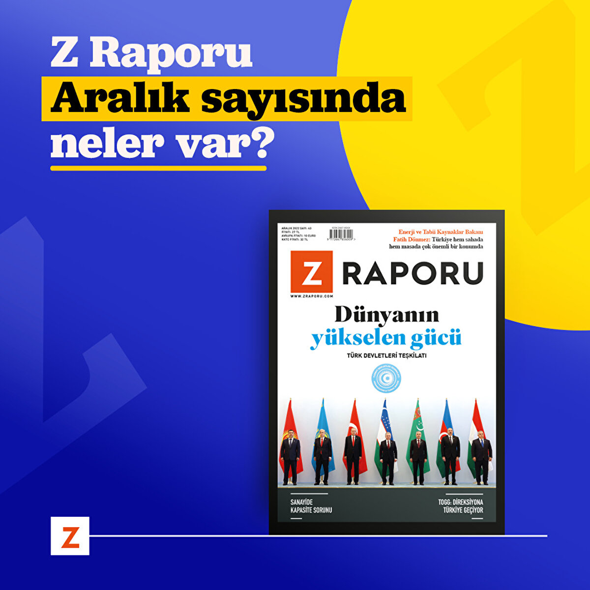 Türk Devletleri Teşkilatı dokuzuncu, yeni adıyla ilk zirvesini Özbekistan'ın ev sahipliğinde Semerkant'ta gerçekleştirdi. “Türk medeniyeti için yeni dönem: Ortak kalkınma ve refaha doğru” temasıyla düzenlenen tarihi zirvede liderler, Türk dünyası 2040 vizyonuna güçlü bağlılıklarını yineledi. 170 milyonluk nüfusu, 4,5 milyon metrekarelik coğrafya ve yaklaşık 1,5 trilyon dolarlık ekonomisiyle TDT, ağırlık merkezi batıdan doğuya doğru kayan küresel ekonomide yükselen bir güç olarak öne çıkıyor. Devamını ve daha fazlasını Z Raporu Aralık sayısında bulabilirsiniz.