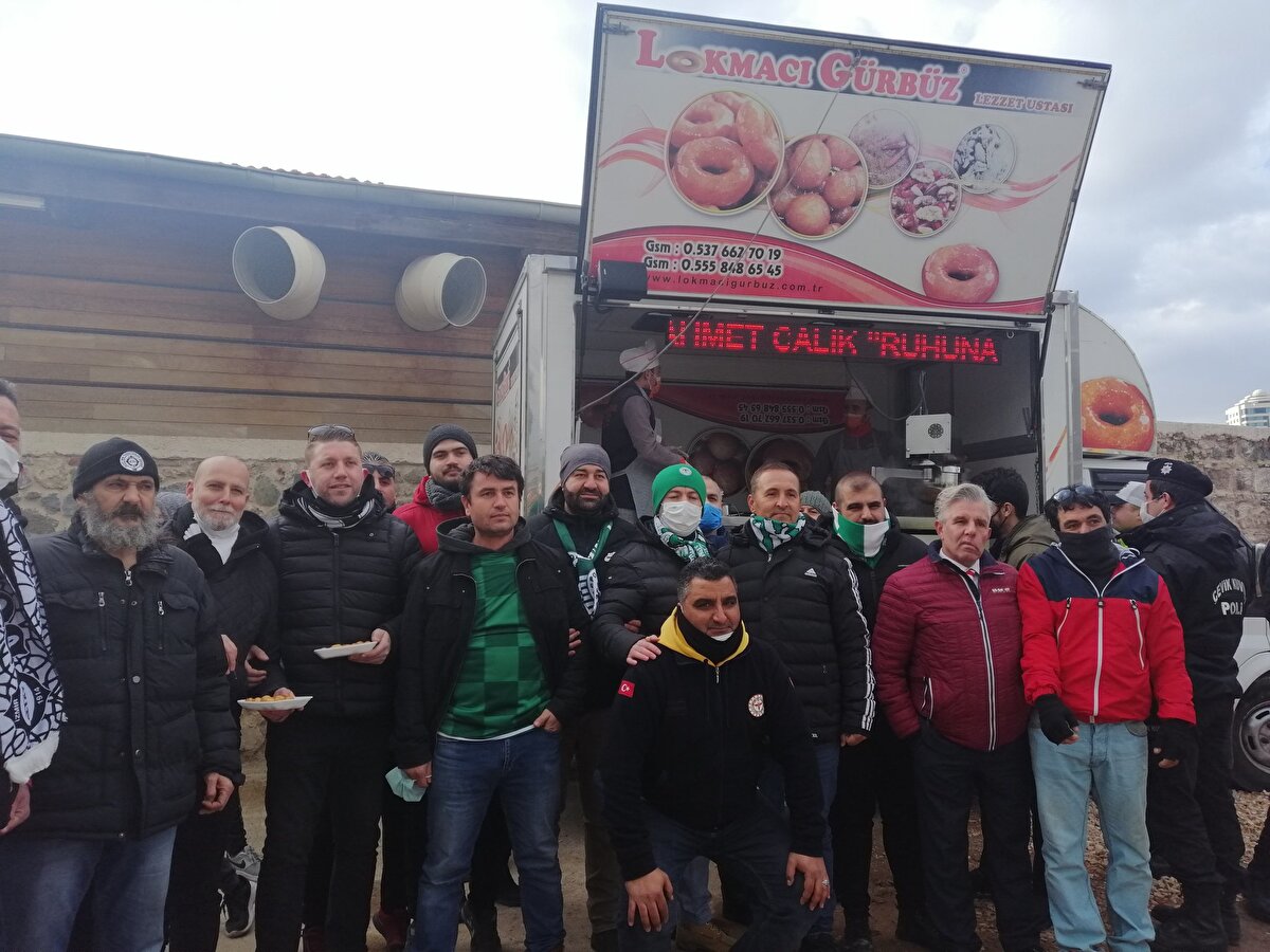 İzmir'de yaşayan Konyasporlu taraftarlar, trafik kazasında hayatını kaybeden Konyasporlu futbolcu Ahmet Çalık için Altay-Konyaspor maçı öncesi lokma dağıttı.