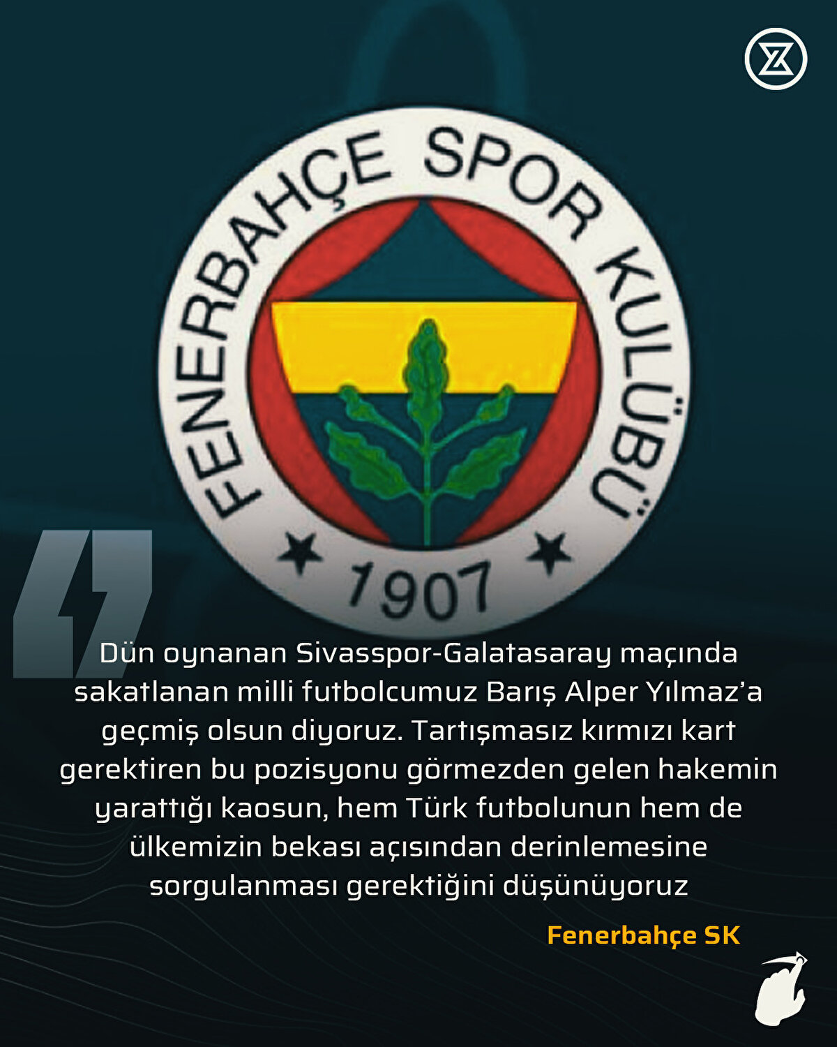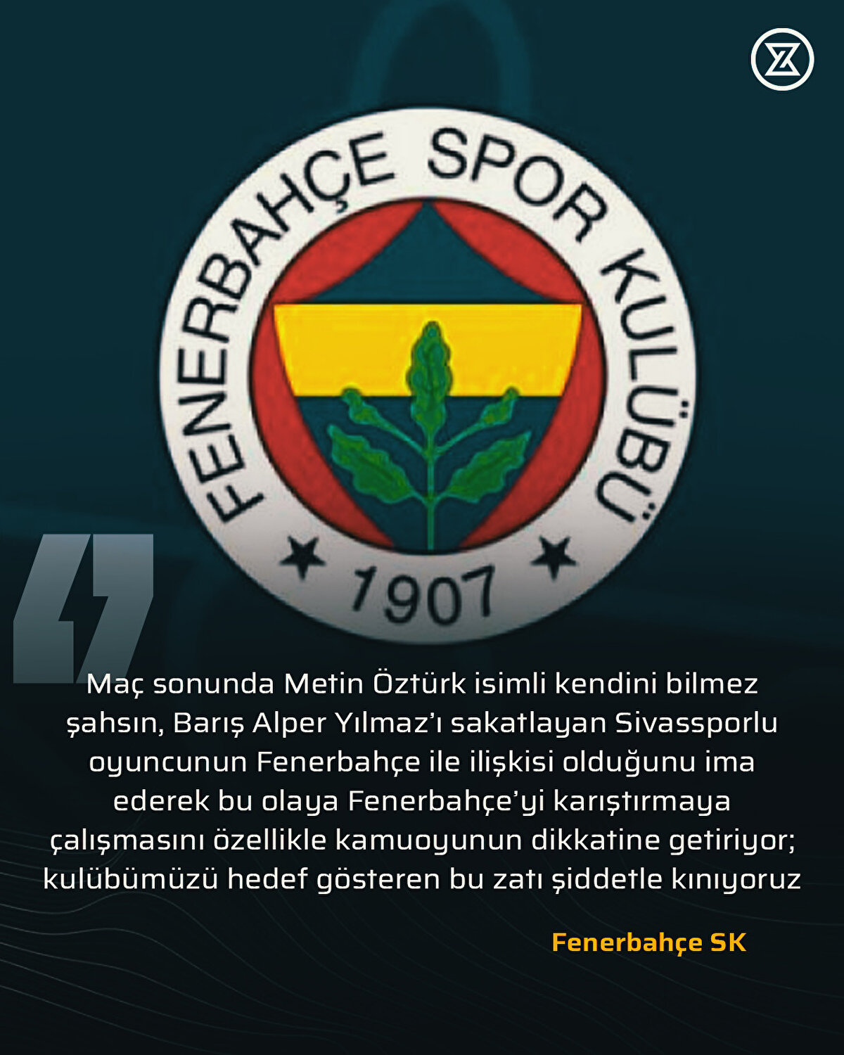 Fenerbahçe'den Galatasaray İkinci Başkanı Metin Öztürk'e yanıt: "Metin Öztürk isimli kendini bilmez şahsın Barış Alper Yılmaz'ı sakatlayan Sivassporlu oyuncunun Fenerbahçe ile ilişkisi olduğunu ima ederek bu olaya Fenerbahçe'yi karıştırmaya çalışmasını özellikle kamuoyunun dikkatine getiriyor. Kulübümüzü hedef gösteren bu zatı şiddetle kınıyoruz. Şeytanın aklına gelmeyecek şekilde Fenerbahçe'yi hedef göstererek Kulübümüze dil uzatan bu şahsı ve temsil ettiği zihniyeti lanetliyoruz."