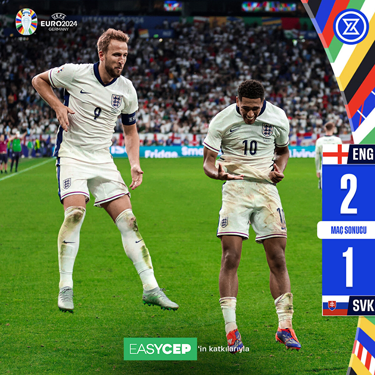 İngiltere, geriye düştüğü müsabakada 90+5. dakikada Jude Bellingham ve 91.dakikada Harry Kane'in attığı gollerle Slovakya'yı 2-1 mağlup ederek adını çeyrek finale yazdırdı.
