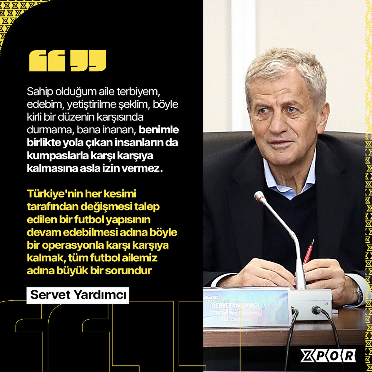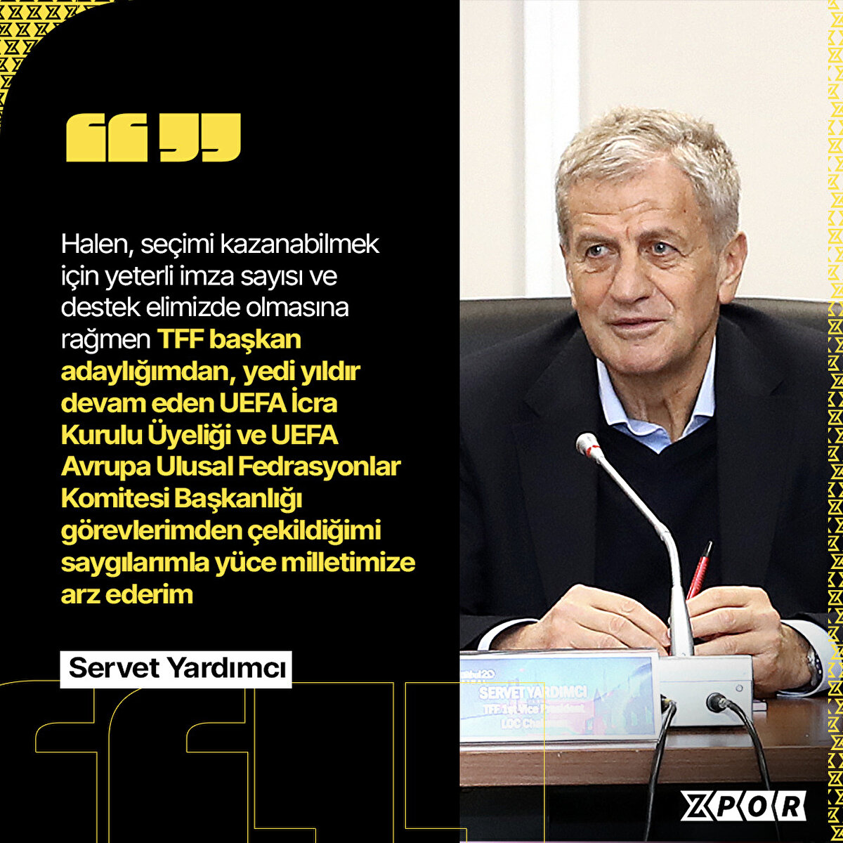 Servet Yardımcı: “En büyük hedefim ve hayalim, Türk futbolunda ve UEFA'da elde ettiğim birikimi ülkemize kazandırmak ve Türk Futbolu'nun hak ettiği marka değerini elde etmesini sağlamak olduğu halde; sahip olduğum karakter ve terbiye ile tamamen ters, yaptıklarımla ve tecrübelerimle asla örtüşmeyecek iftiralarla dolu kirli bir operasyona maruz kaldım. TFF başkanlığına adaylığımı açıklamamın ardından, malum kirli yapı tarafından mevcut sistemin devam edebilmesi adına başlatılan kumpas, Rizeli Yardımcı ailesinin ve benimle birlikte yola çıkan insanların geçmişiyle ve ahlâkıyla asla bağdaşmayacak şekilde, yalanlarla, iftiralarla, kumpaslarla, şahsımı, ailemi, onurumu, haysiyetimi, itibarımı, hedef almaktadır. Sahip olduğum aile terbiyem, edebim, yetiştirilme şeklim, böyle kirli bir düzenin karşısında durmama, bana inanan, benimle birlikte yola çıkan insanların da kumpaslarla karşı karşıya kalmasına asla izin vermez. Türkiye'nin her kesimi tarafından değişmesi talep edilen bir futbol yapısının devam edebilmesi adına böyle bir operasyonla karşı karşıya kalmak, tüm futbol ailemiz adına büyük bir sorundur. Halen, seçimi kazanabilmek için yeterli imza sayısı ve destek elimizde olmasına rağmen, TFF başkan adaylığımdan, yedi yıldır devam eden UEFA İcra Kurulu Üyeliği ve UEFA Avrupa Ulusal Fedrasyonlar Komitesi Başkanlığı görevlerimden çekildiğimi saygılarımla yüce milletimize arz ederim.”