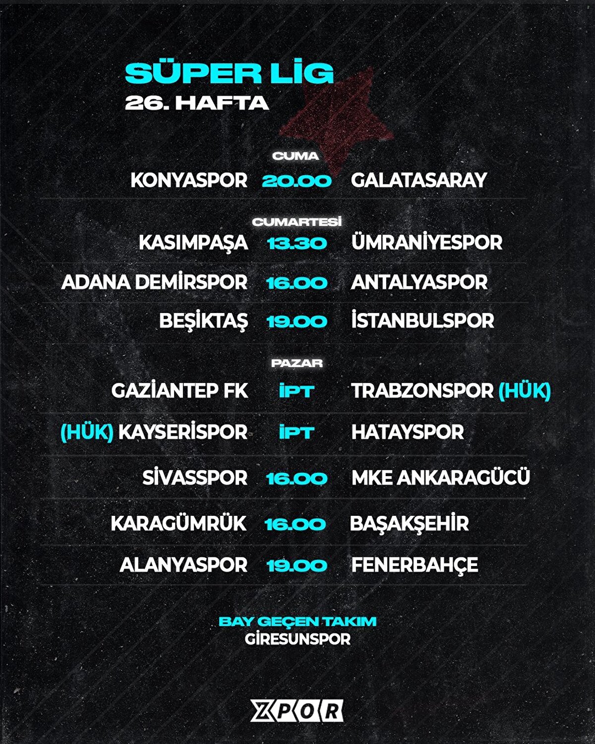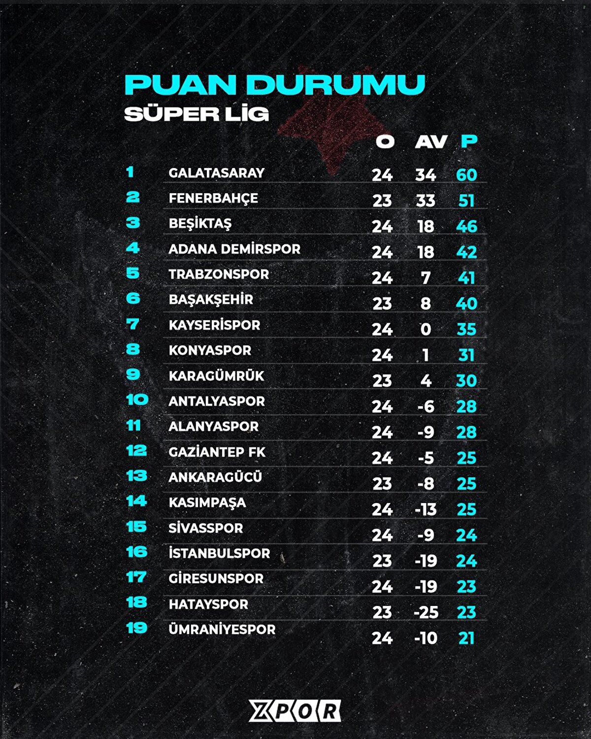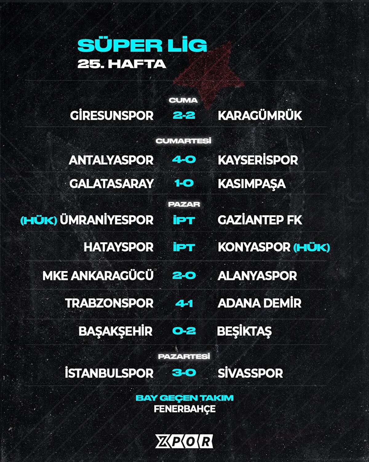 Süper Lig'de 25. haftada alınan sonuçlar, puan durumu ve 26. hafta fikstürü