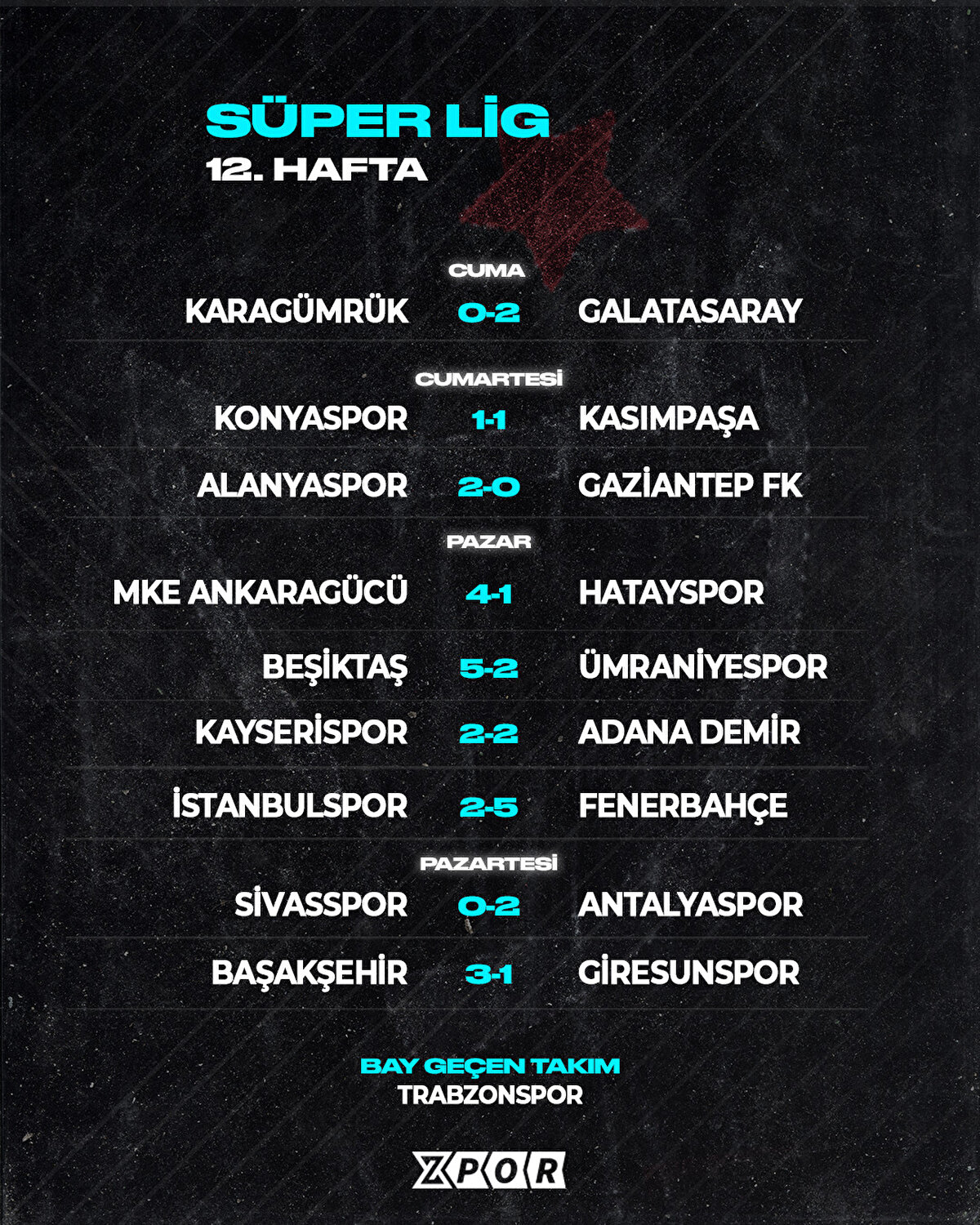Süper Lig'in 12. haftasında alınan sonuçlar, ligde oluşan puan durumu ve 13. haftanın fikstürü