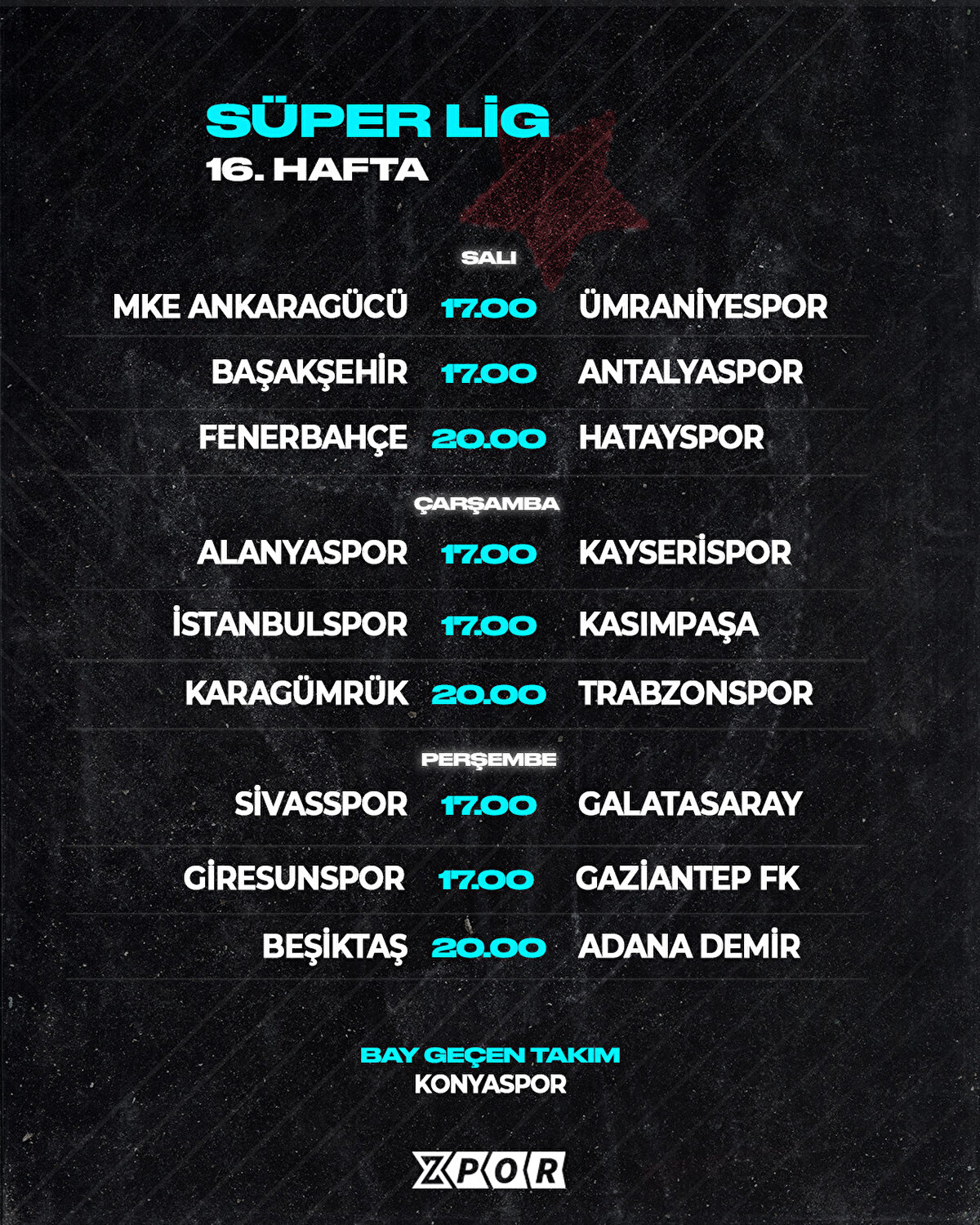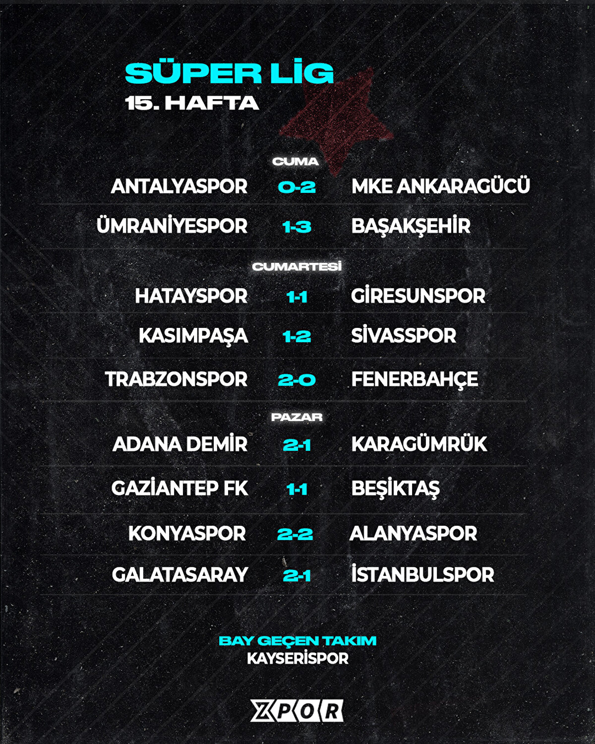 Süper Lig'in 15. haftasında alınan sonuçlar, oluşan puan durumu ve 16. hafta fikstürü