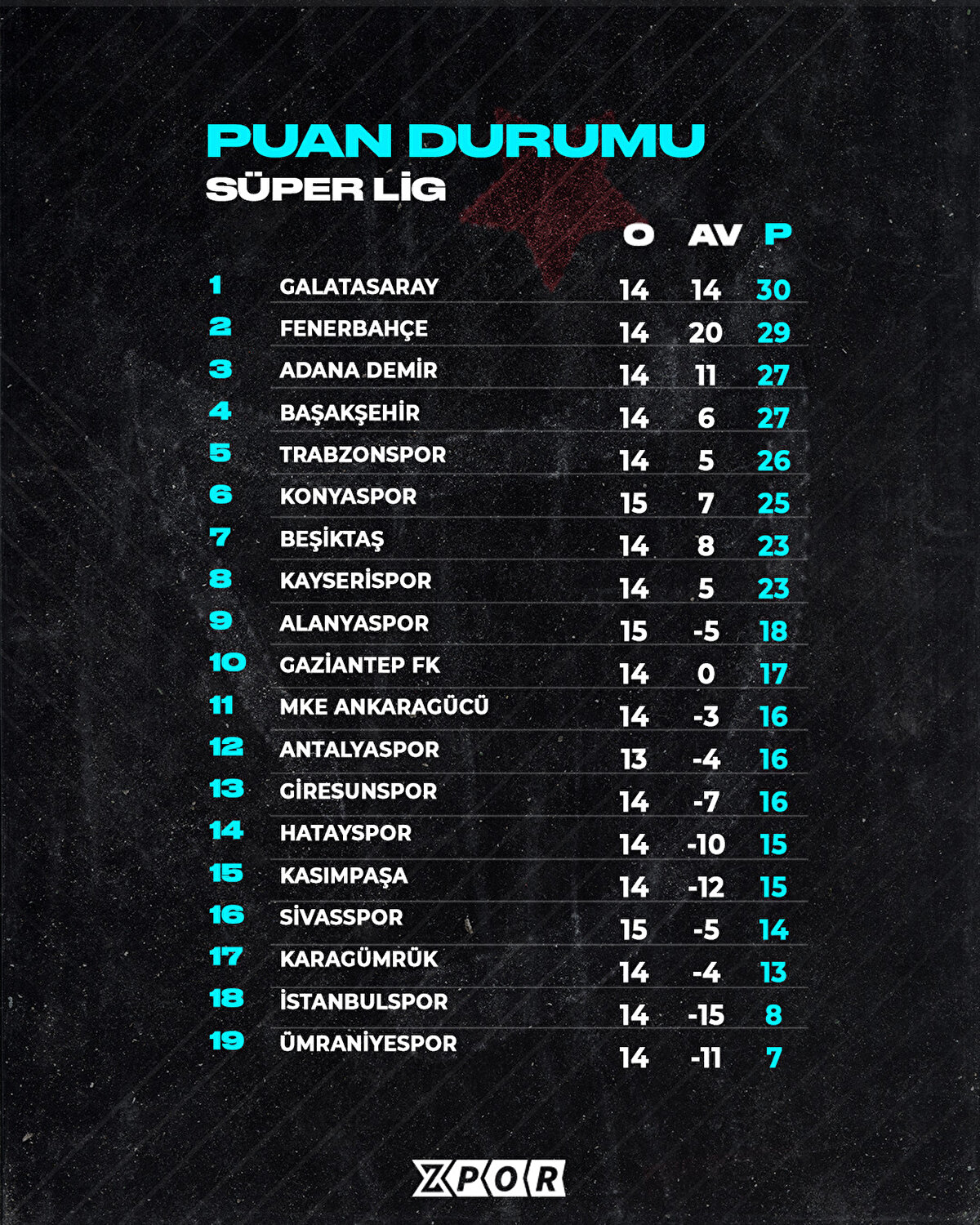 Süper Lig'in 15. haftasında alınan sonuçların ardından Galatasaray liderlik koltuğuna oturdu.