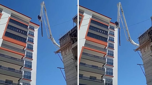 Elazığ’da bir işçi, bindiği beton pompa aracının hortumuyla 10 katlı binanın tavanına kadar çıkıp canını hiçe saydı. Korkutan dakikalar cep telefonu kamerasına yansıdı.
