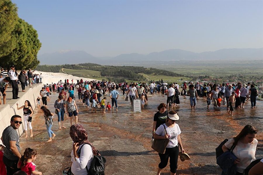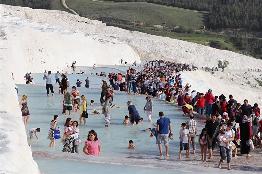 Pamukkale'ye gelen yerli ve yabancı turistler, travertenler üzerinde yürüdü, hatıra fotoğrafı çektirdi, bazıları ise antik havuzda termal suların keyfini çıkardı.