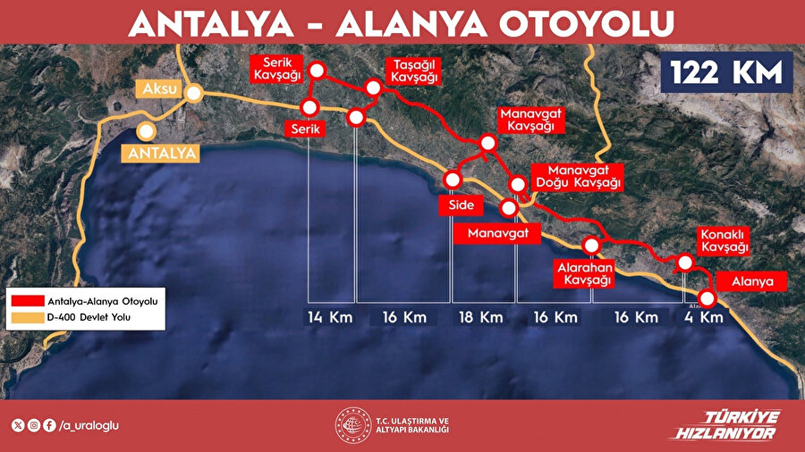 Bakan Uraloğlu, yaptığı yazılı açıklamada, Antalya ile Alanya arasında hızlı ulaşımı sağlayacak Antalya-Alanya Otoyolu'nun temelinin 25 Temmuz Cuma günü atılacağını kaydetti. Uraloğlu, "Bu dev projemizle sadece ulaşımı kolaylaştırmayacağız aynı zamanda bölgenin turistik, ekonomik ve sosyal gelişimine de katkı sağlayacağız. Toplam 122 kilometre uzunluğundaki otoyolun; 84 kilometresi ana yol, 38 kilometresi bağlantı yolları olmak üzere inşa edilecek. Güzergah Serik Kavşağı’ndan başlayarak Toros Dağları’nın eteklerinden ilerleyecek ve Konaklı’nın kuzeyinde Alanya Batı Kavşağı’nda son bulacak" ifadelerini kullandı.