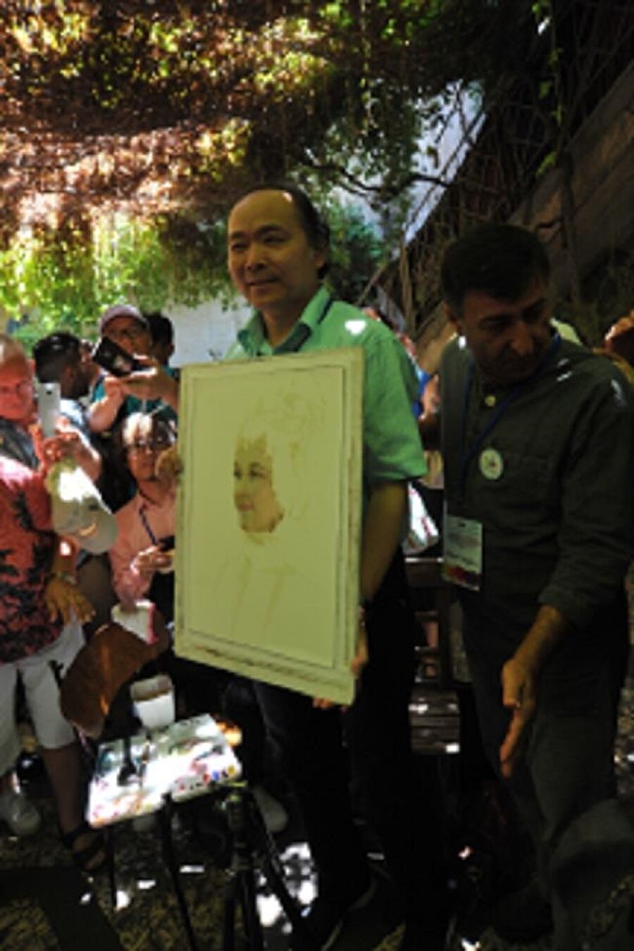 Konuşmaların ardından ünlü ressam Yi, halk oyunları ekibinden Duygu Koçak'ın suluboya portresini çizdi.