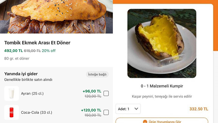 Paylaşımların ardı arkası kesilmezken özellikle yemek sipariş uygulamalarında fiyatların daha da artığı görüldü. İndirim kuponlarıyla vatandaşı çekmeye çalışan restoranların çoğunun piyasanın oldukça üstünde olan ücretleri dikkat çekti.