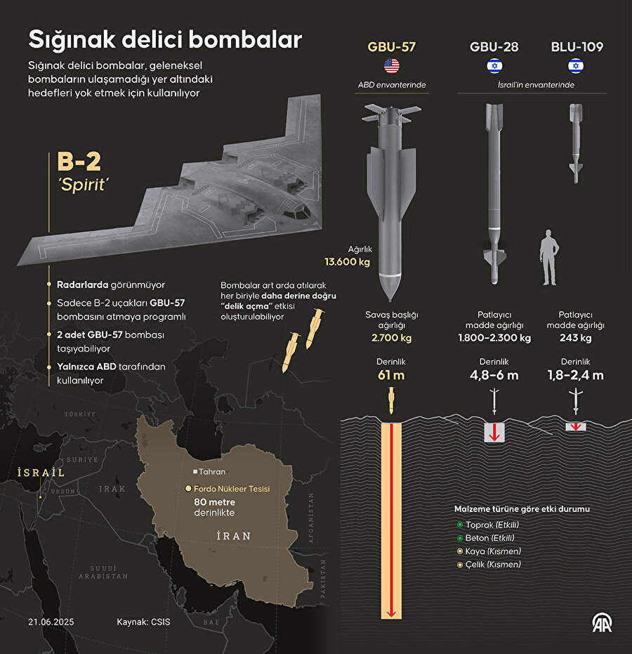 ABD'nin, İran'ın üç nükleer tesisinden en önemlisi olan Fordo'yu 6 sığınak delici mühimmat kullanarak vurduğu, diğer iki tesisin ise bölgedeki Amerikan denizaltılarından fırlatılan 30 Tomahawk füzesiyle yok edildiği iddia edildi.