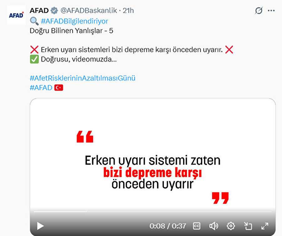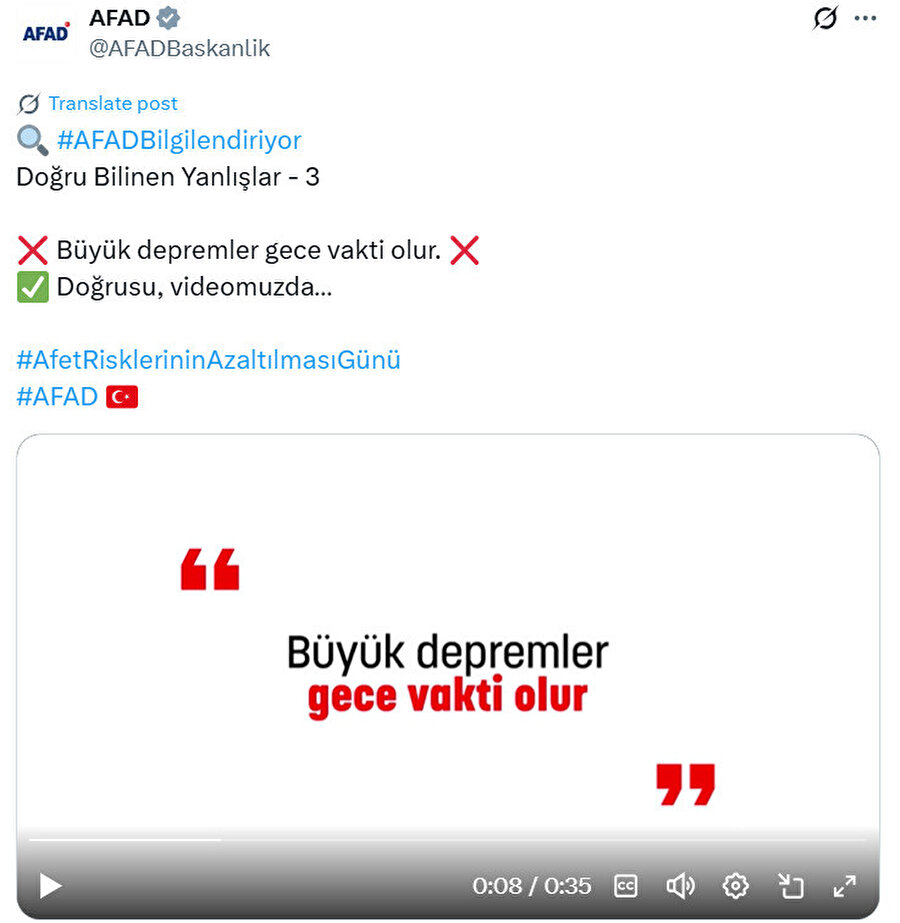 Afet ve Acil Durum Yönetimi Başkanlığı, Uluslararası Afet Risklerinin Azaltılması Günü kapsamında, depremler hakkında kamuoyunda "doğru bilinen yanlışlar"la ilgili video serisi hazırladı.