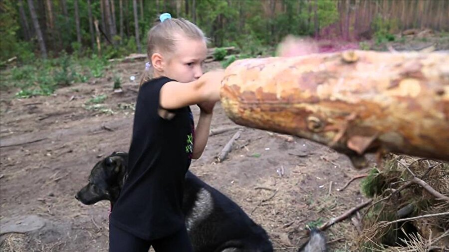 Evnika. 8 yaşındaki minik boksör doğada ağaç ve tomruk gibi materyallerle antrenman yapıyor. Küçük yaştaki boksörün çevikliği ve acıya dayanıklılığı izleyenleri şaşırtıyor.