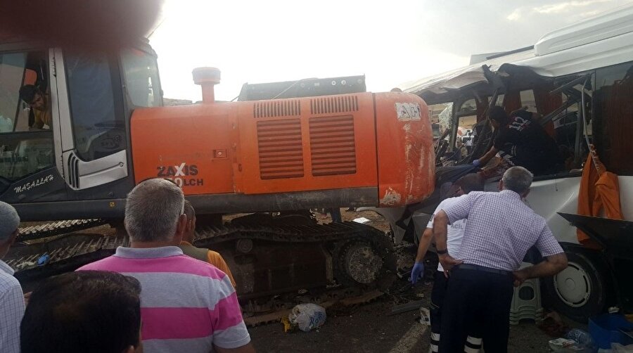 Düşen iş makinesi bu sırada karşı yönden gelen midibüse çarptı.Kazada, midibüsteki 7 kişi araçta sıkışarak hayatını kaybetti, 11 kişi de yaralandı.