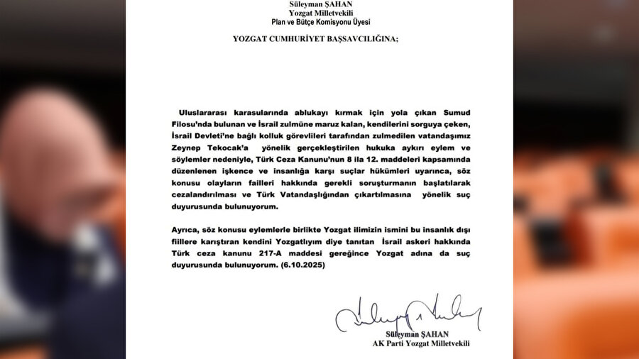 AK Parti Yozgat Milletvekili Süleyman Şahan, Sumud Filosu’nda yer alan aktivistlerden Zeynep Tekocak’a Yozgatlı olduğunu iddia eden İsrailli asker hakkında suç duyurusunda bulundu.