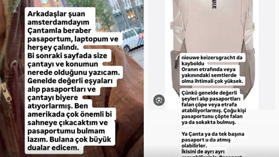 - "Arkadaşlar, şu an Amsterdam’dayım. Çantamla beraber pasaportum, laptopum ve her şeyim çalındı. Bir sonraki sayfada size çantayı ve konumun nerede olduğunu yazacağım. Genelde değerli eşyaları alıp pasaportları ve çantayı bir yere atıyorlarmış. Ben Amerika’da çok önemli bir sahneye çıkacaktım ve pasaportumu bulmam lazım. Bulana çok büyük dualar edeceğim"