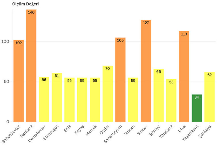 Saat 10.00'da Batıkent'te 140 olarak ölçülen hava kirliliği, Keçiören Sanatoryum'da 105, Siteler'de 127, Ulus'ta 113, Bahçelievler'de ise 102'ye çıktı.