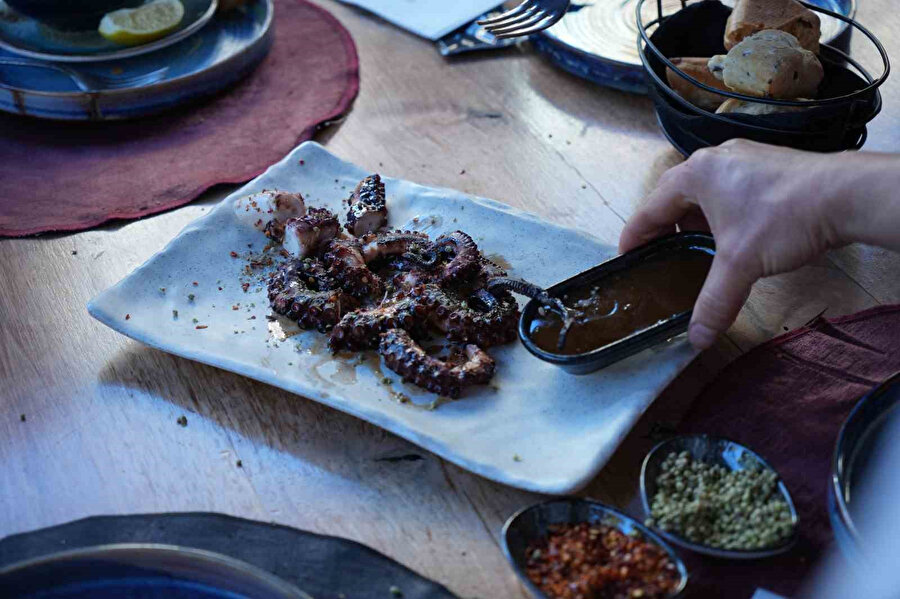Ahtapotları önce kaynar suyun içinde beklettikten sonra döner tezgahında özel tereyağlı sosu ile hazırlayan Gezen kardeşler, yaptıkları denemeden başarılı sonuç aldı.