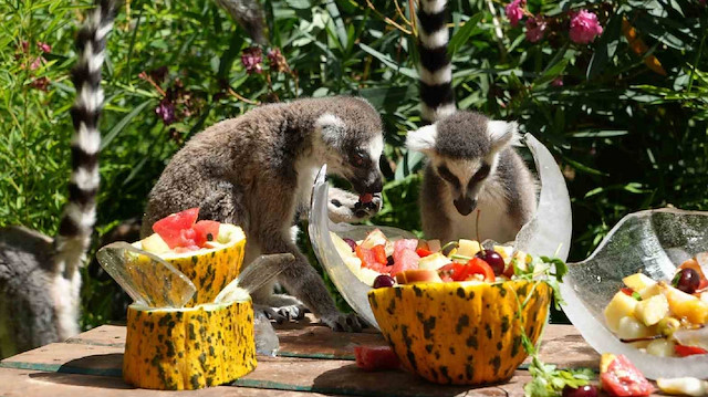 Park çalışanları, sıcaklardan etkilenen hayvanlar için buz kalıpları içerisinde meyve ve sebzelerden oluşan karışımlar hazırlıyor. Bozayı, lemur ve maymunlar, karpuz, muz, elma, portakal ve kiraz gibi meyvelerden oluşan buzlu kokteyli keyifle tüketirken bu anlar ziyaretçilerin de ilgisini çekiyor.