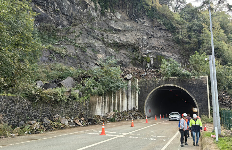 Yamaçtan kopan toprak ve kaya parçaları tünel girişine düşerken, bölgeden geçen bazı araçlar heyelandan saniyelerle kurtuldu.