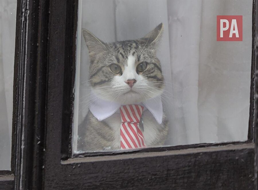 WikiLeaks'in kurucusu Julian Assange, Ekvador'un Londra Büyükelçiliği'nde hakkındaki tecavüz iddiaları nedeniyle İsveçli savcılar tarafından sorgulanırken, kedisi de binanın penceresinden dışarıyı izledi. Dikkatleri çekense kediye takım elbise giydirilmiş olmasıydı.