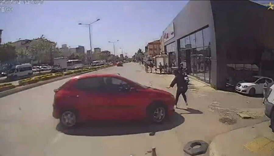 Görüntülerde otomobilin savrularak yolda yürüyen kadına çarptığı anlar yer alıyor.