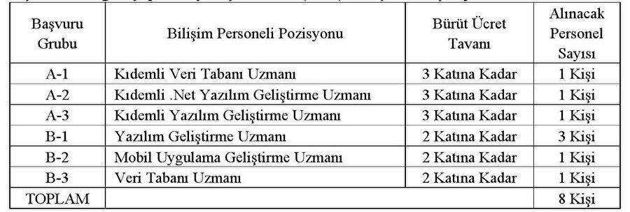 - d) Yazılım, yazılım tasarımı ve geliştirilmesi ile bu sürecin yönetimi konusunda veya büyük ölçekli ağ sistemlerinin kurulumu ve yönetimi konusunda, son başvuru tarihi itibariyle ücret tavanı iki katını geçmeyecekler için en az 3 (üç) yıllık, diğerleri için en az 5 (beş) yıllık mesleki tecrübeye sahip olmak (Mesleki tecrübenin belirlenmesinde; bilişim personeli olarak 657 sayılı Kanuna tabi kadrolu veya aynı Kanunun 4 üncü maddesinin (B) bendi ya da 399 sayılı Kanun Hükmünde Kararnameye tabi sözleşmeli statüdeki hizmetler ile özel kesimde sosyal güvenlik kurumlarına prim ödenmek suretiyle işçi statüsünde bilişim personeli olarak geçtiği belgelenen hizmet süreleri dikkate alınır.),